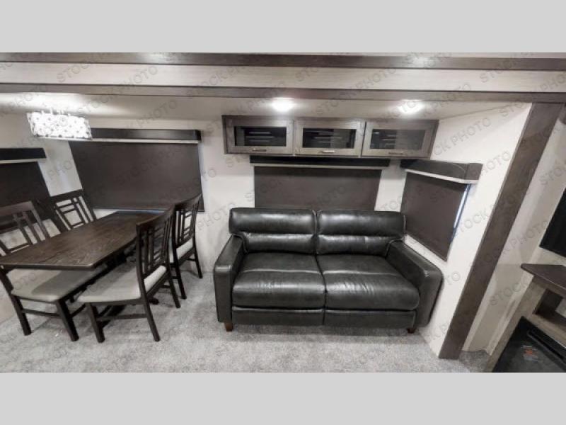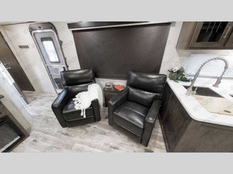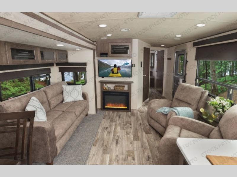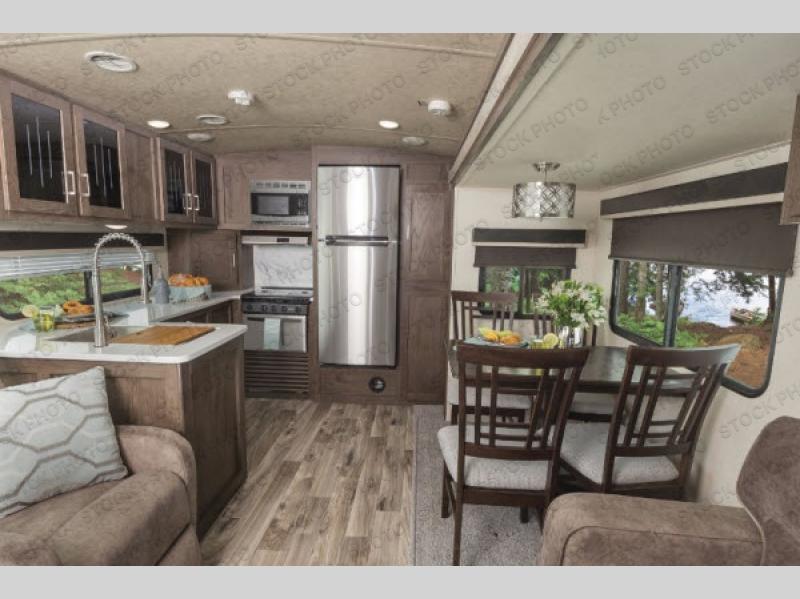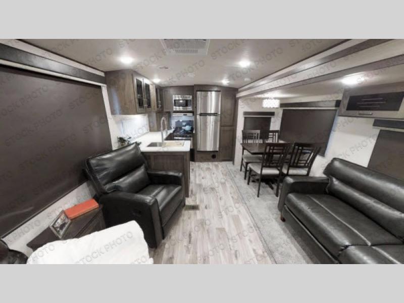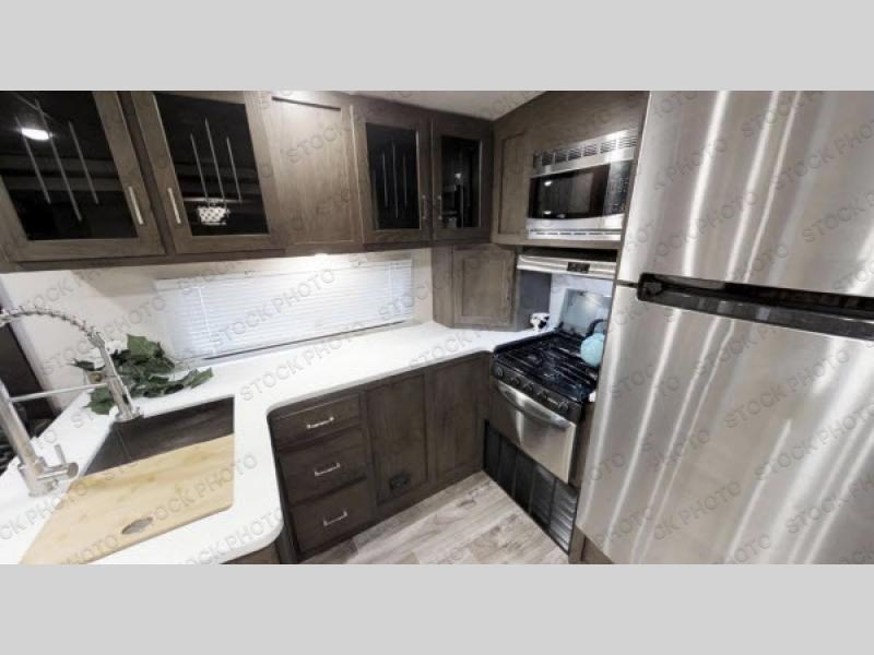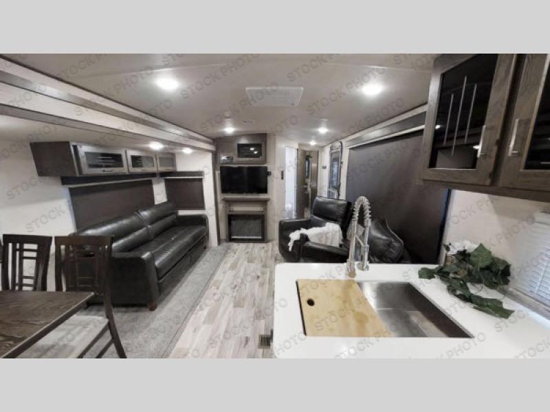 For your next camping trip you will want this single slide out Salem Hemisphere GLX 282RK travel trailer in tow. Your family of five can camp in comfort and style with this travel trailer. Outside there is a 21' awning which provides plenty of shade plus maximizes your outdoor living space. With the large pass through storage area you will have enough room for all of your camping gear. This model also has an optional exterior kitchen as well as an optional swivel gas grill which makes cooking outdoors easy. Inside you will find plenty of living space with the single slide out along the roadside. The rear kitchen has plenty of counter space as well as overhead cabinets. In the evening you can watch a favorite movie or TV show at the living room 32" HDTV and enjoy a fire in the fireplace.