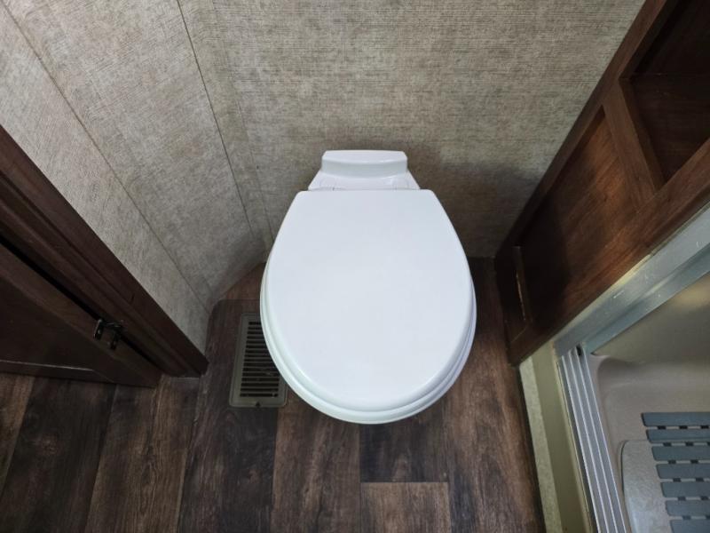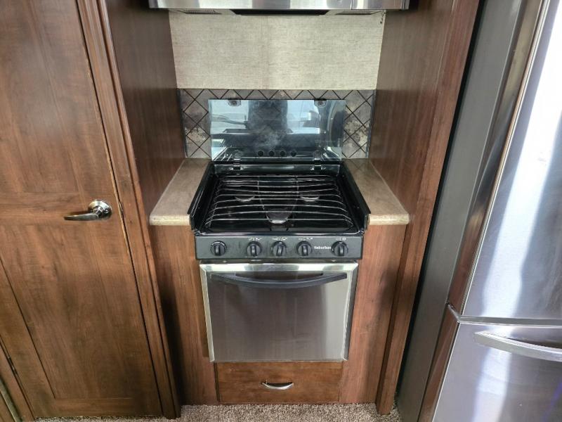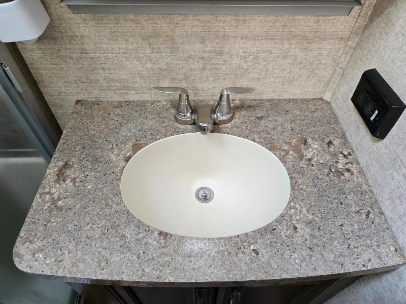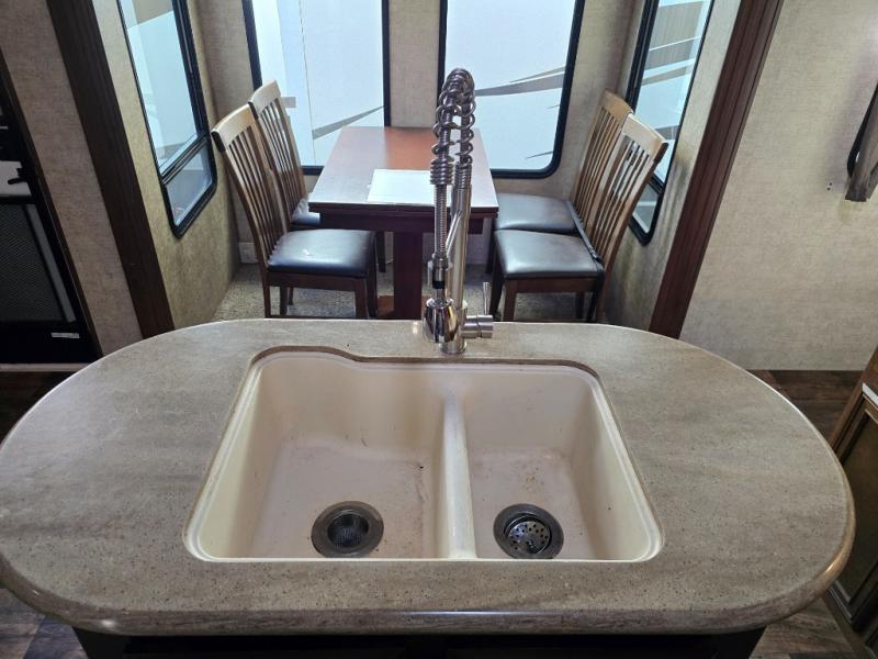 When you choose to camp with a Sandpiper fifth wheel by Forest River you are choosing a quality built fifth wheel with plenty of features and comforts to go around. Along the exterior there are large tinted windows, a "One Touch" Dometic electric awning with an LED light strip, 2 LED lighted exterior speakers, plus a docking station for easy winterization, hot and cold spray port, black tank flush, and pull valves for the tanks. Inside there is Beauflor rustic wood plank linoleum, a decorative backsplash, a 40" flat screen LED HDTV, plus a 9 cu. ft. stainless refrigerator. You can also choose from a few optional packages such as the Polar Tech Package, the Premium Package Plus which is offered for a limited time, and the Sandpiper Signature Package.