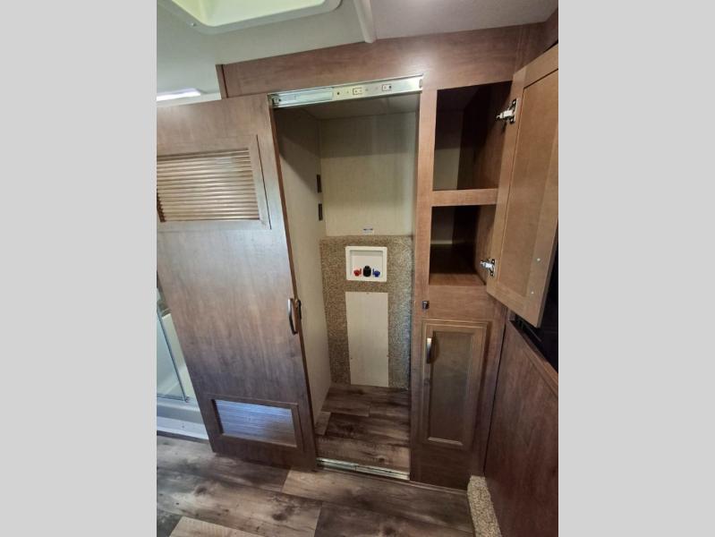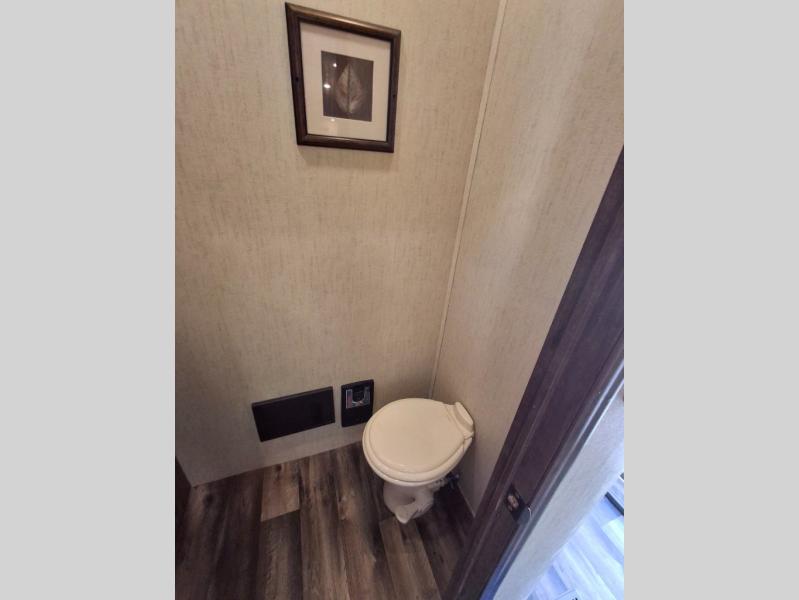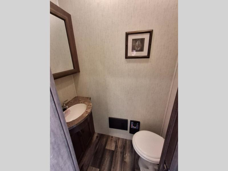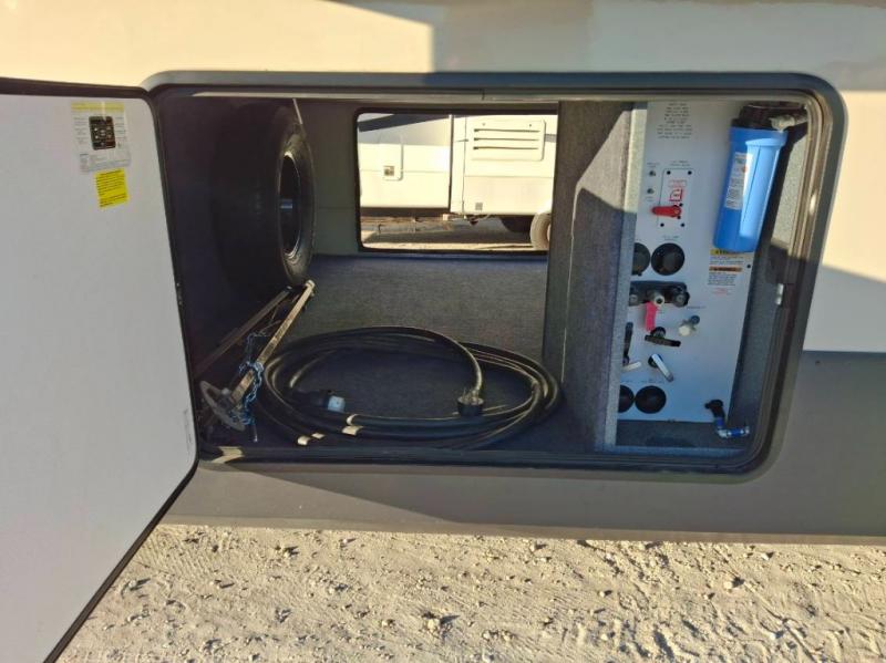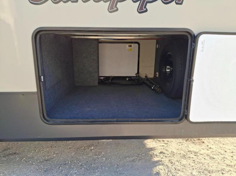 When you choose to camp with a Sandpiper fifth wheel by Forest River you are choosing a quality built fifth wheel with plenty of features and comforts to go around. Along the exterior there are large tinted windows, a "One Touch" Dometic electric awning with an LED light strip, 2 LED lighted exterior speakers, plus a docking station for easy winterization, hot and cold spray port, black tank flush, and pull valves for the tanks. Inside there is Beauflor rustic wood plank linoleum, a decorative backsplash, a 40" flat screen LED HDTV, plus a 9 cu. ft. stainless refrigerator. You can also choose from a few optional packages such as the Polar Tech Package, the Premium Package Plus which is offered for a limited time, and the Sandpiper Signature Package.