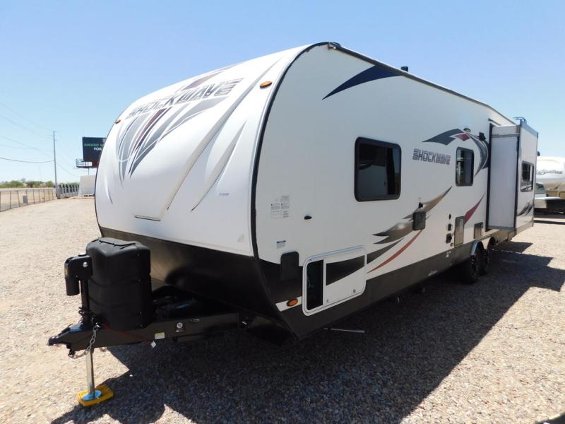 Forest River offers this Shockwave DX Series model 27RQDX with sleeping for six people and over fourteen feet of cargo space.