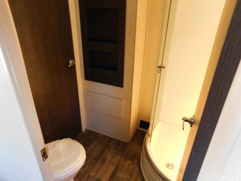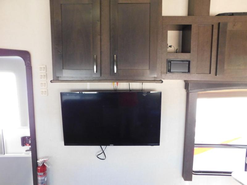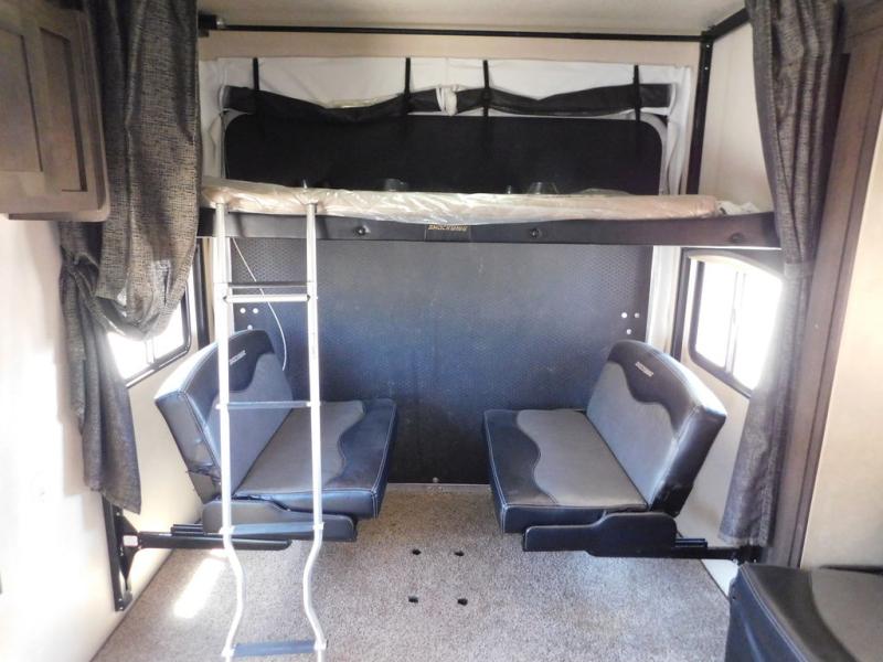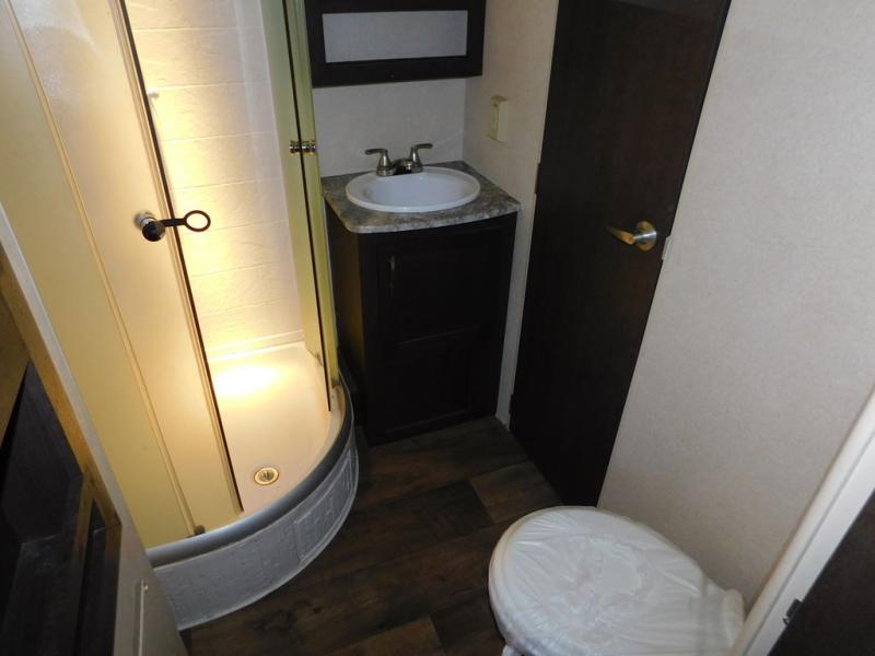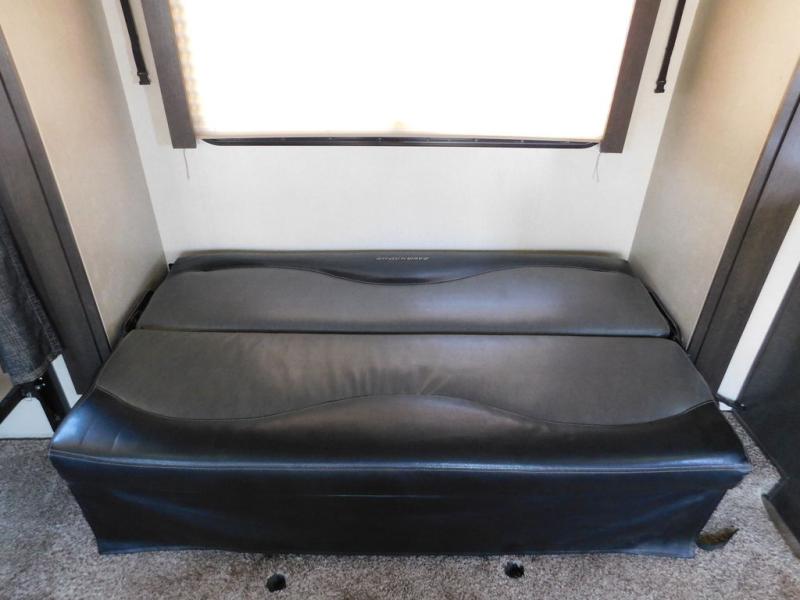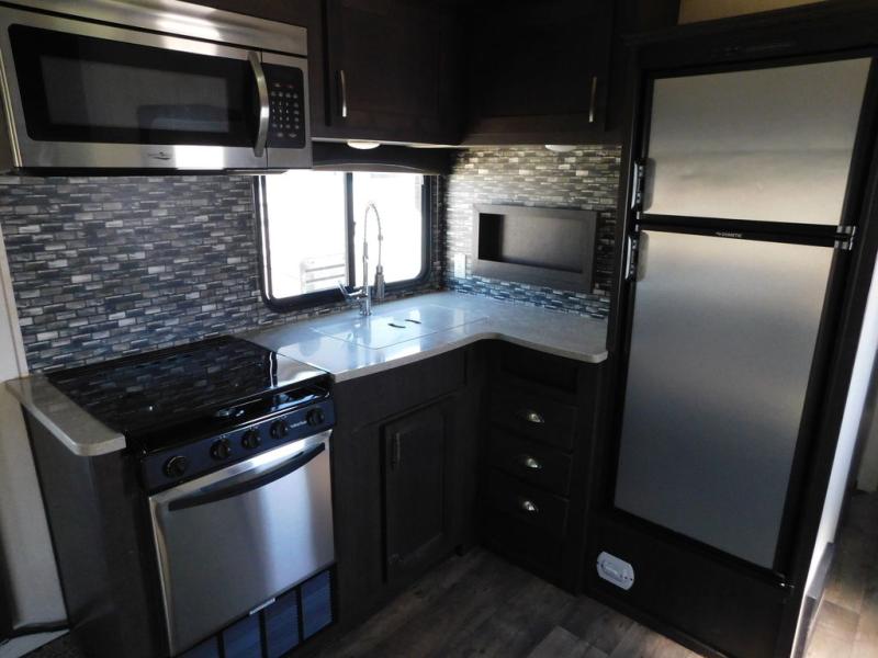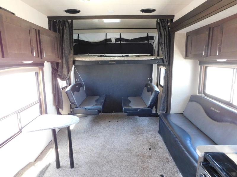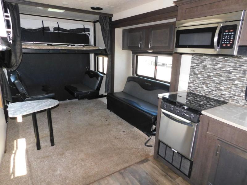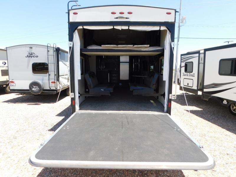 This toy hauler travel trailer includes rear entry for your toys via the easy lift sport ramp. Inside, there is an electric bed with a roll over sofa. Moving forward the road side includes a fold down sofa, a pedestal table, and overhead cabinets. You may choose an optional sofa slide out instead of the fold down sofa. The curb side features two swivel chairs with a table between them as well as more overhead cabinets. You may choose an optional flip up dinette.