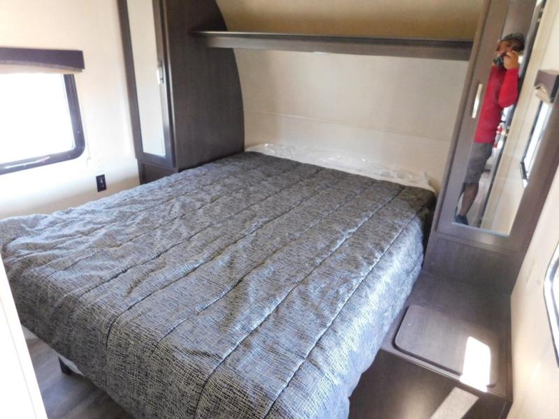 The front bedroom features a walk around queen bed with a wardrobe on each side and an overhead cabinet.
