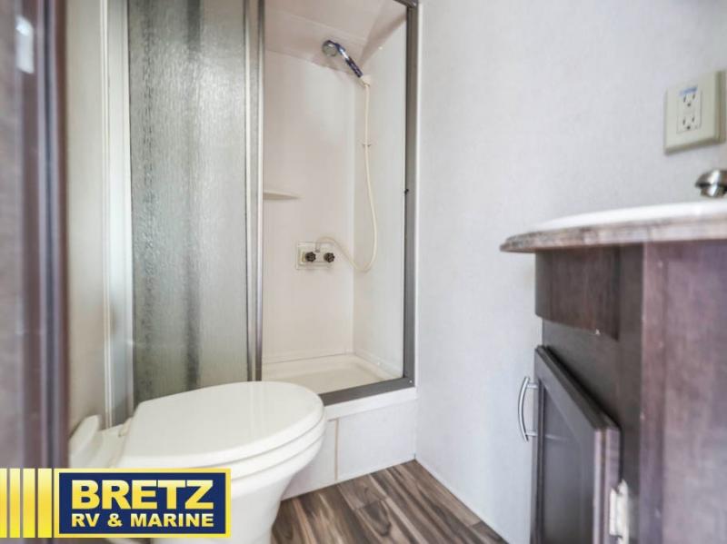 A front corner bathroom includes a corner vanity sink, toilet and a shower with optional glass door.