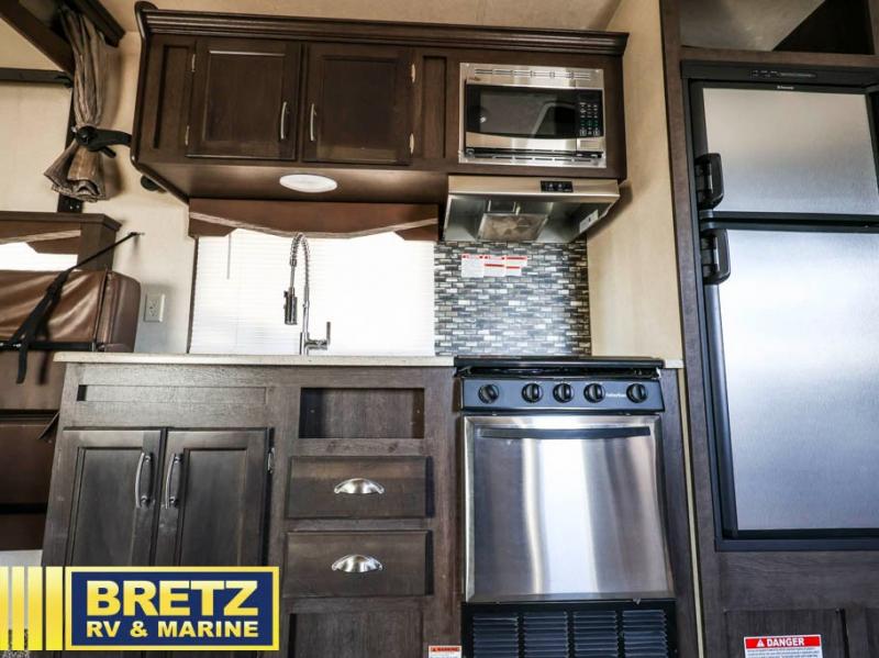 The kitchen includes a double sink, overhead microwave, three burner cook top with oven and refrigerator. To the left of the entry door there is an overhead cabinet where you can store any riding gear that you may have.