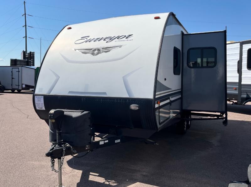 For any camping trip you will want a Forest River Surveyor travel trailer. These models are lightweight and easy to tow, plus you will find that inside there is superior craftsmanship throughout. Along the interior there is a barreled ceiling which adds more headroom in each model. Once you reach your destination then you can enjoy the view from the large panoramic windows. The designer Carefree flooring is stylish and easy to clean, and the entertainment center features a USB charging port for your electronic devices. There are several packages available such as the LE Value Package, the Surveyor Value Package, and the Fall Program Package - so now you can easily choose the features that are right for you! What are you waiting for? Come select your Surveyor travel trailer today!