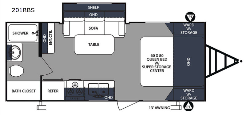 Get ready to make plenty of memories camping with your family with this Surveyor 201RBS travel trailer. This model features sleeping space for four people. Along the front there is a queen bed with storage below. You can enjoy your meals at the sofa and table. Throughout this model you will find Shaker style cabinets. The handy rear bathroom makes it easy to get ready for your day. All of your extra camping gear can be stored in the pass through storage area.
