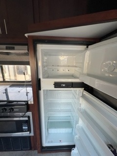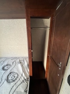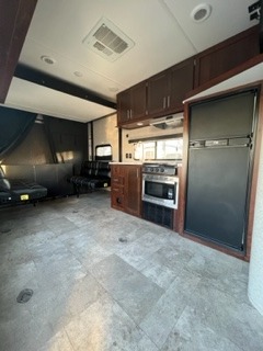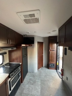The kitchen area offers a double kitchen sink, three burner range, microwave, and a refrigerator. Above the refrigerator you will find a TV. There is a closet next to the entrance door. To the left of the entry door you will find two optional chairs, an overhead cabinet.
