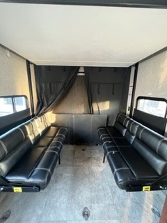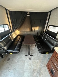 In the rear of the toy hauler, you will find two flip-up sofas with a free standing table. After your gear is unloaded this area makes for a nice area to enjoy your meals during the day, and at night you can easily convert the sofas into additional sleeping space.