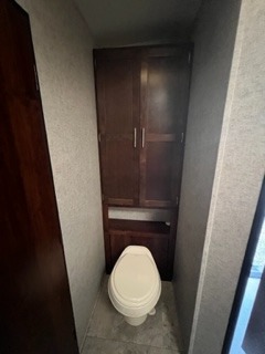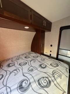 There are plenty of overhead cabinets throughout this toy hauler as well as outside storage and a mount for an outside TV, and more!
