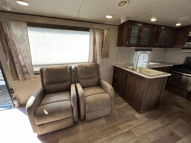 When you are ready for comfort and adventure, take a look at this Vibe travel trailer. Model 268RKS offers a single slide out in the main living and kitchen area providing more walking around space for everyone, plus furniture to dine, visit, or sleep at night. You are sure to enjoy the two recliners as well. The rear kitchen layout offers a stainless steel package, and solid surface countertops for preparing meals including a decorative backsplash to add to the style. The dual entry bath allows quick access across from the main entry into the trailer as well as the front master bedroom for those nighttime visits. There are many more features to see, and options to choose from.