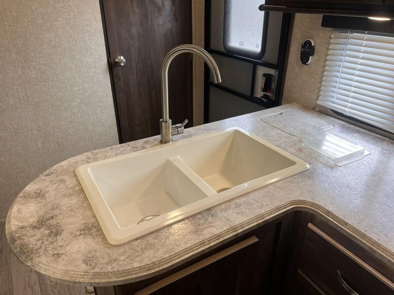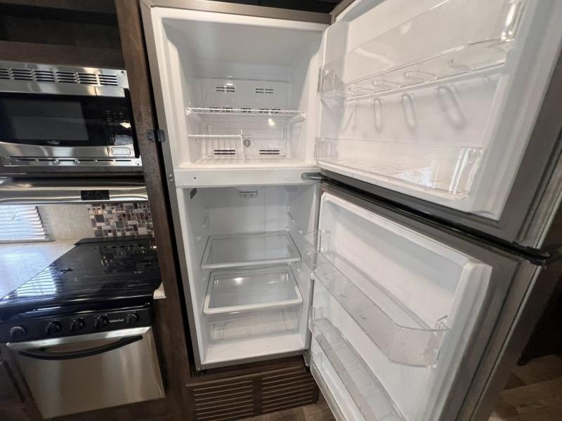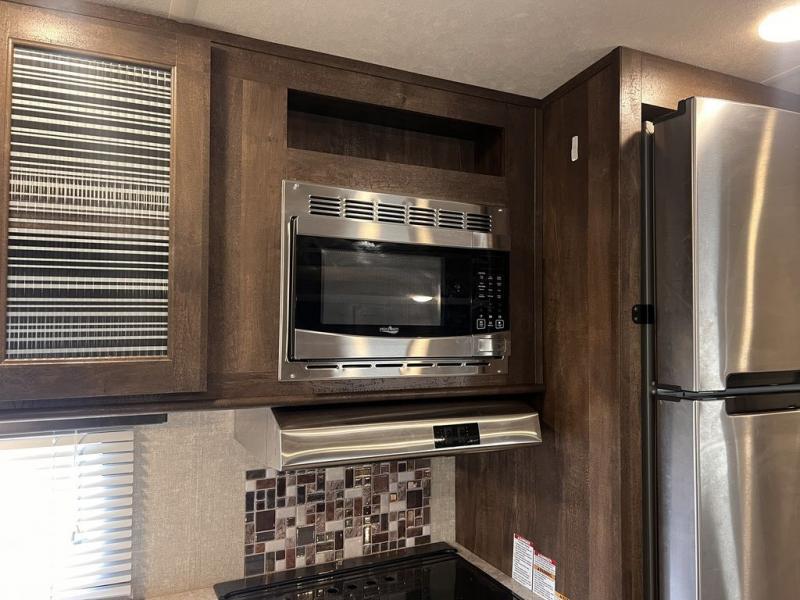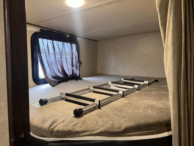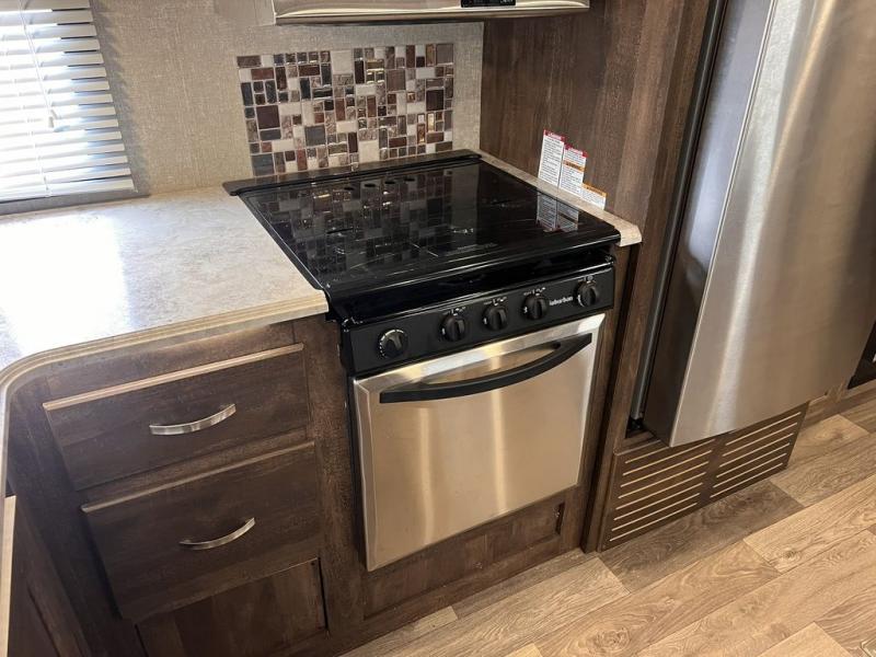 If you have been looking for the perfect travel trailer with sleeping space for 9 family members, stop and take a look at this Vibe. Model 284BHS offers a set of double size bunk beds for the kiddos, and a full bath just steps away. The single slide out provides seating and extra sleeping space with the furniture, plus additional interior floor space to move from one end of the trailer to the other. You can enjoy the 50" TV and entertainment center while watching the big game or movies on a rainy day, or during the evening before bedtime. The kitchen offers a stainless steel package, solid surface countertops for preparing meals including a decorative backsplash, and a large pantry for your dry goods. Come check out this Vibe, and load up your family for fun and adventure!