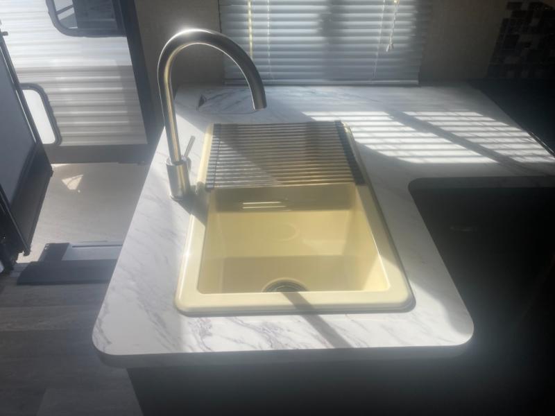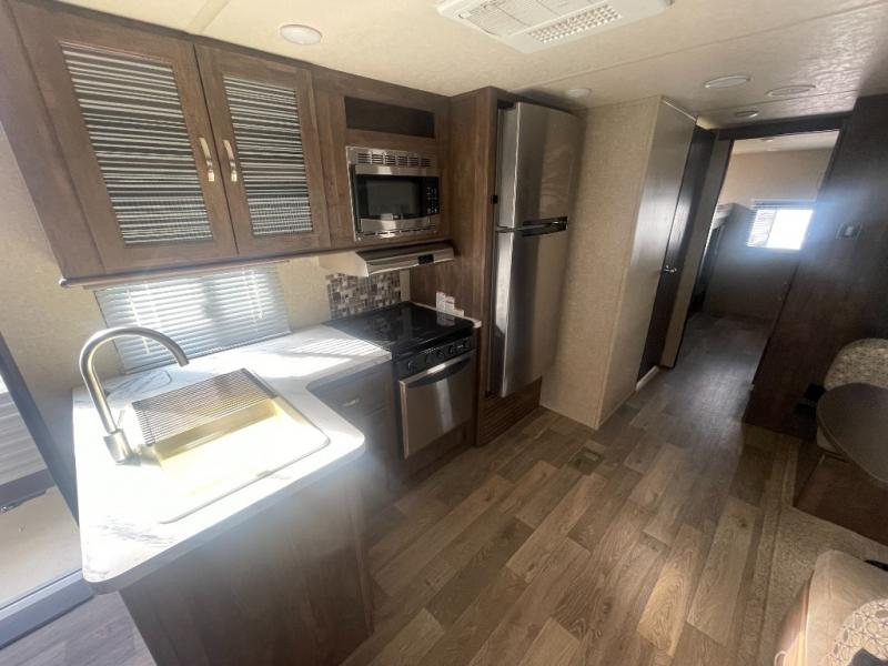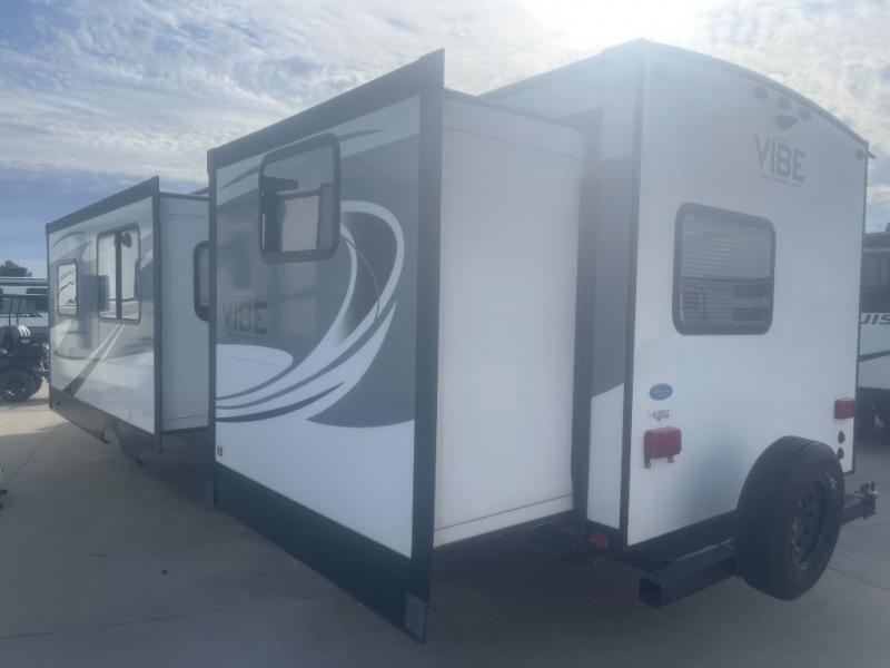 Easily load up your family and head out to your favorite campground with this Vibe Extreme Lite 306BHS travel trailer. Just imagine the kiddos relaxing in their own bunkhouse in the rear of the trailer, and the bathroom is just outside the door. Inside the bath you will find the second entry into the trailer as an added convenience for quick access from outside. You all can visit while sitting at the U-shaped dinette and sofa when not outside exploring. The chef will love the style of the kitchen which features a stainless steel package, solid surface countertops, a decorative backsplash, and all the appliances needed to make meals. You might even choose an optional kitchen outside. Don't worry about missing any conveniences and comforts of home while you are staying in this double slide out Vibe Extreme Lite!