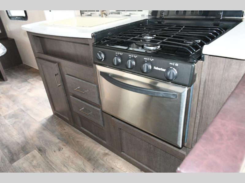 At the front, a dedicated queen bed gives you a comfortable place to recharge after long days outdoors. Mid-coach, the spacious kitchen provides everything needed for everyday cooking, including a three-burner range, refrigerator, pantry storage, and generous overhead cabinets for your cookware and dry goods.