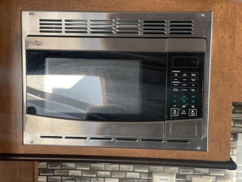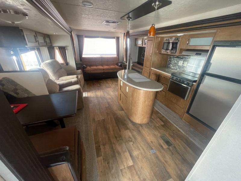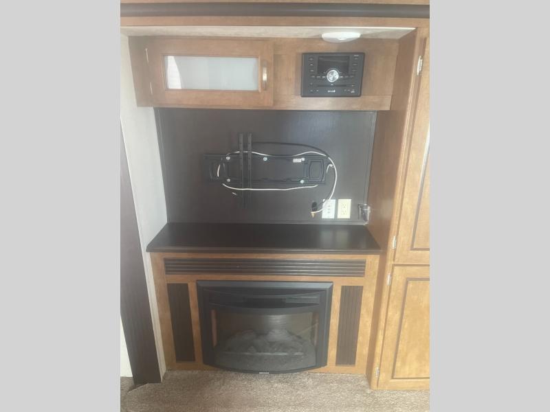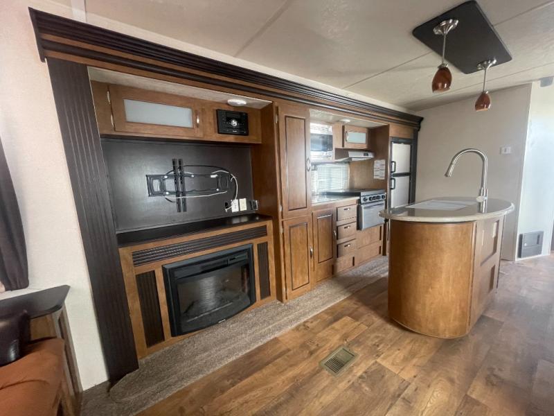 Start your next camping trip in this double slide out, rear living, 27REI Wildwood travel trailer by Forest River. This model also features a kitchen island and plenty of room for your family of five. The kitchen island provides you with extra counter space and a more homey feel. There is a fireplace for those cooler evenings, just curl up with a book and a cozy blanket and enjoy being indoors. If the day is nice, outdoors you can enjoy the 11' and the 9' awnings which provide shade from the sun, there is some exterior storage for your camping gear as well.