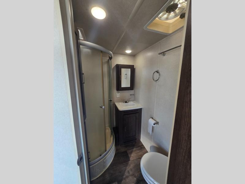 This model is great for a medium sized family. There is a rear kitchen that is great for prepping meals, enjoying them together, and then cleaning up afterward. The sofa, booth dinette, and two recliners are perfect for relaxing, playing games, or just enjoying one another's company. The sofa and dinette both fold down into sleeping space at night if needed. There is also plenty of storage throughout this unit, with overhead cabinets and wardrobes on the inside, there is some pass through storage outside as well. Put up the 16' awning, add a couple of camp chairs and enjoy the great doors with a little bit of shade.