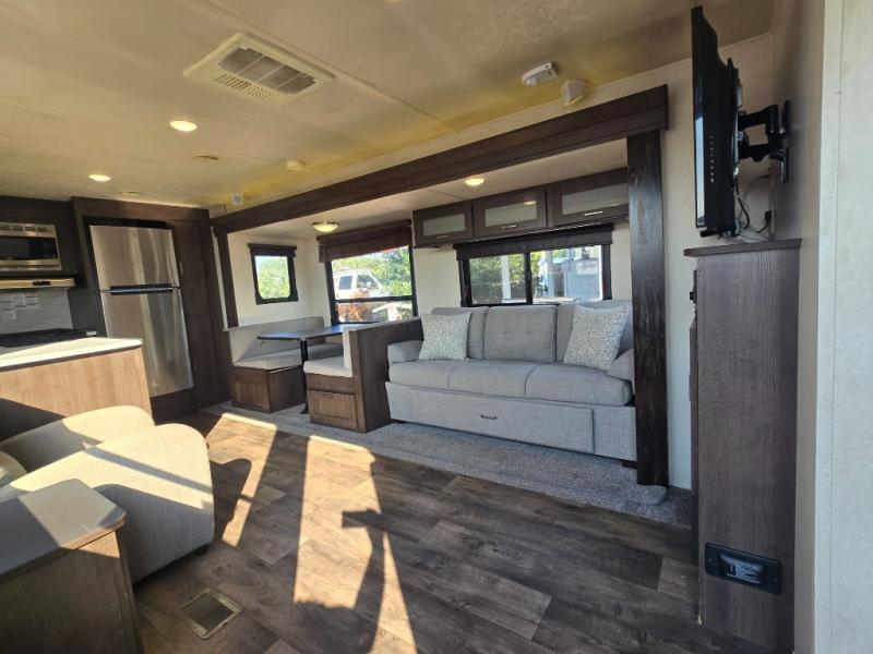These Wildwood travel trailers are something to take a look at! Inside you have 27" overhead cabinets giving you plenty of space for storing the items you take with you. There is even a large pots and pans drawer under the dinette. Storage under the bed is an added perk, so there is no need to worry about how much you bring with you. The triple seal slide out system keeps all the rain and excess water out, and all of the heat or cool air in. The safety glass windows are there to look nice and also if they were to break you won't have to worry about anyone getting cut. Outside these travel trailers, the tires are filled with nitrogen, and the frames are built with a powder coated I-beam frame.