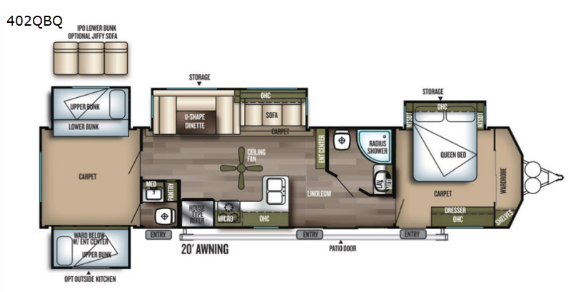 Let this Wildwood DLX 402QBQ be the answer to your camping needs! From quad slide outs to the rear bunkhouse for your kids there is plenty of room throughout this model. You will enjoy the convenience of three entry doors, plus there is a bath and a half. In the kitchen you can enjoy your meals at the u-dinette and then come relax at the sofa. Outside there is a 20' awning which provides plenty of shade from the sun during the day, plus you can even add an optional outside kitchen!