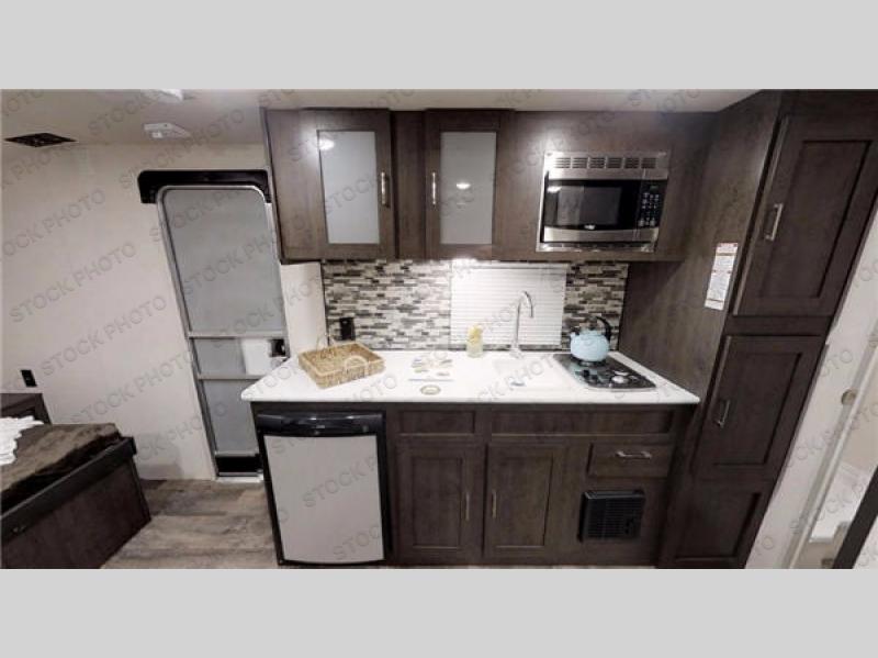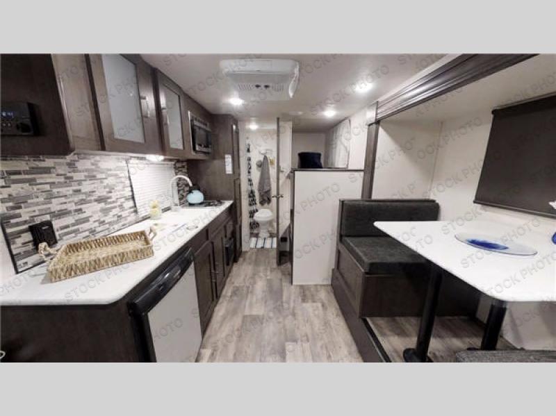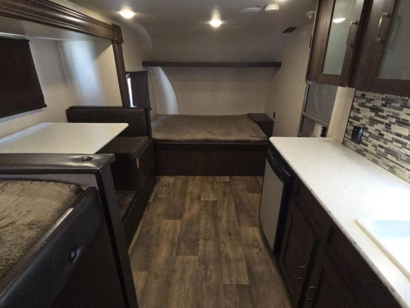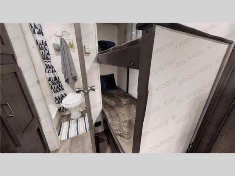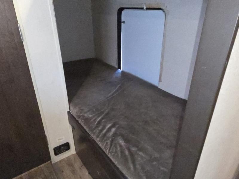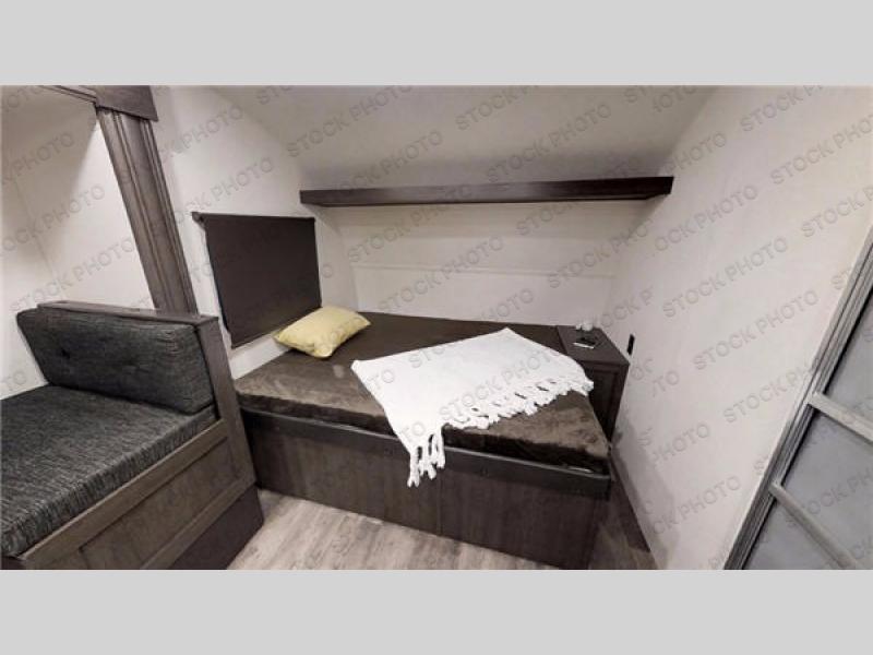 The perfect size camper for a family of four with plenty of storage both inside and out. This bunk model features a single slide for added interior space, a set of 30" x 74" bunks that the kids will surely like, and a side facing queen bed up front. A full kitchen allows you to cook meals and snacks easily, and the rear corner bath will keep everyone feeling clean and fresh. You will appreciate the exterior cargo door beneath the bunks featuring 41 cu. ft. of added storage space, plus so much more!