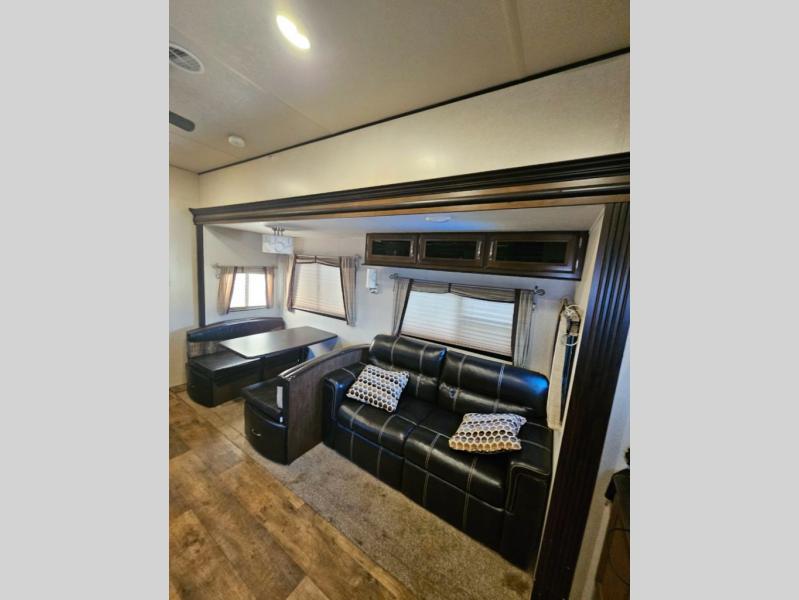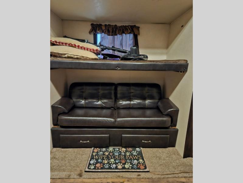 As you step inside the main entry to your left there is a pantry, refrigerator, three burner range, microwave, and a kitchen sink. On the opposite side of the fifth wheel you will find a slide out jumbo dinette and a tri-fold sofa. Next to the sofa you can enjoy relaxing while watching the entertainment center and fireplace. There are plenty of overhead cabinets in this combined kitchen and living area.