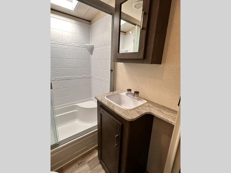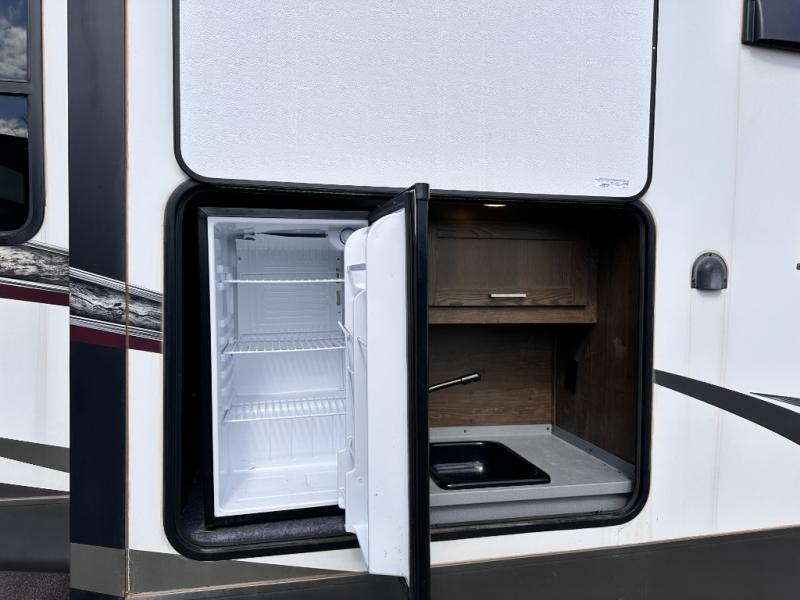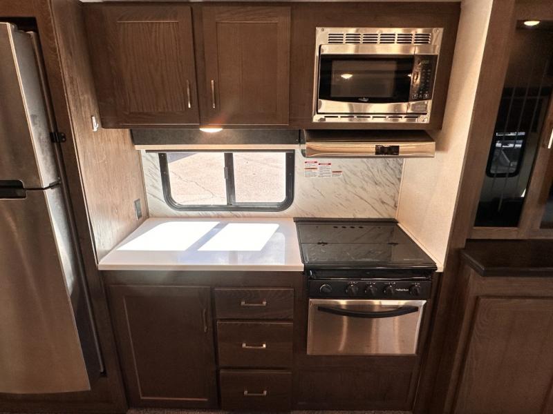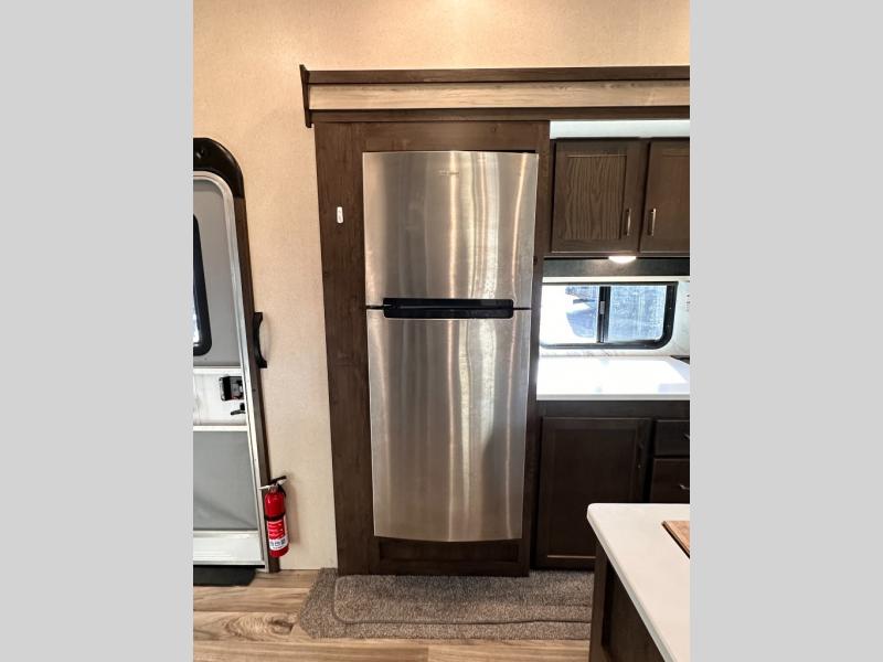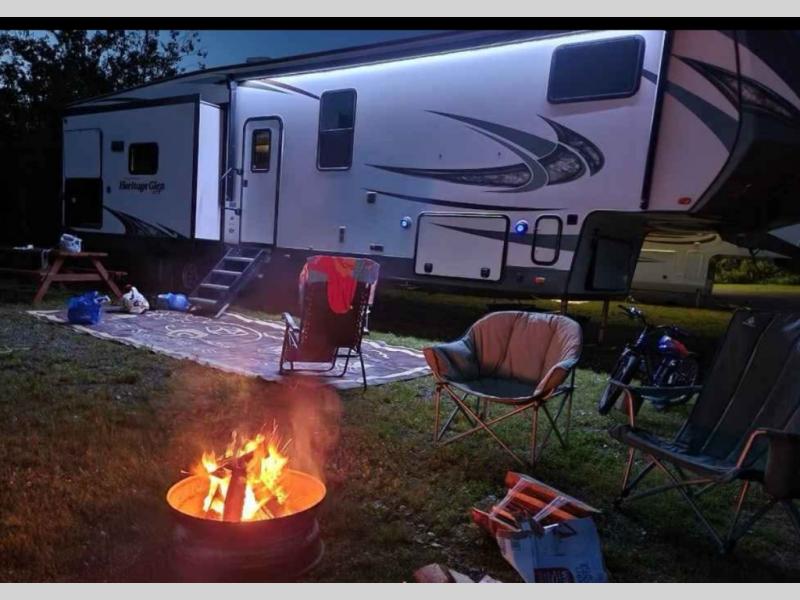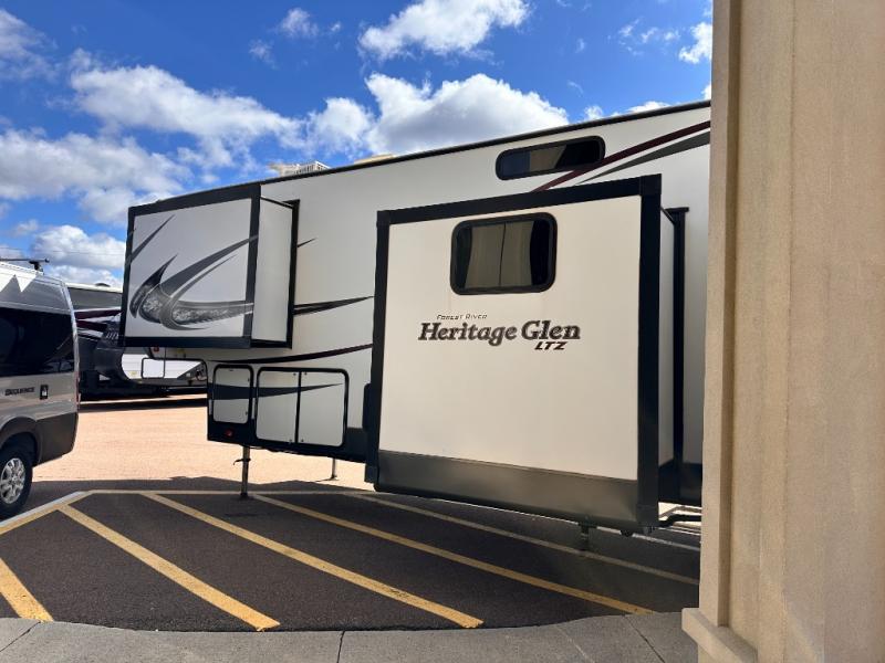 When you want time away from home, but yet want the comforts of home, then choose a Wildwood Heritage Glen LTZ fifth wheel by Forest River. These models have plenty of residential features such as a stainless steel Dometic double door refrigerator, an under mount sink, stain resistant carpet and Beau plank wood linoleum. Along the exterior you will find an aerodynamic front cap with LED light strips, gel coated fiberglass exterior, and marine grade exterior speakers with a blue LED light. The One Touch electric awning provides plenty of shade and allows you to instantly have a nice outdoor living space and more!