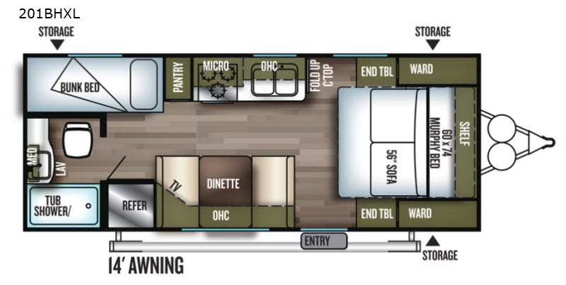 Load up your family and head on out to your favorite campground with this Wildwood X-Lite 201BHXL travel trailer. Your kids can have their own sleeping space at the rear bunk beds while mom and dad can have the 60"x74" Murphy Bed. During the day after the bed is put away then you can easily set up the 56" sofa for a nice front living area. With the convenience of the rear bathroom now you won't have to use the campground facilities. The 14' awning provides plenty of shade during the day and helps to maximize your outdoor living space and more!