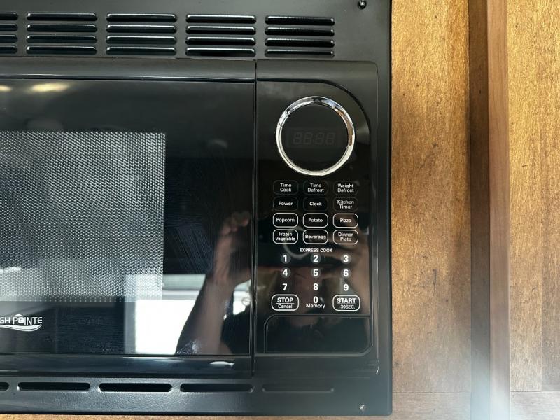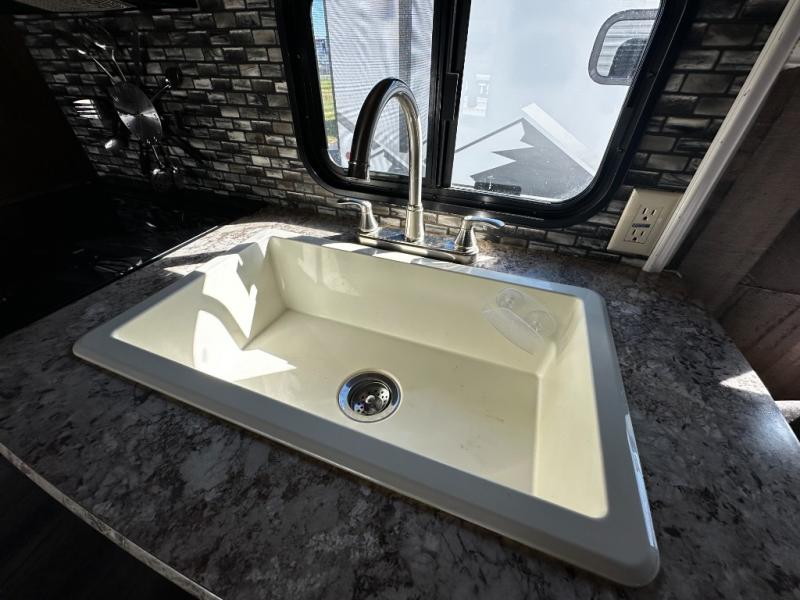 The fully equipped kitchen makes meal prep a breeze on the road. You’ll find a roomy refrigerator, a reliable range with oven, microwave, and plenty of countertop space—perfect for everything from quick breakfasts to family dinners. Thoughtful storage solutions keep cookware, snacks, and essentials neatly organized and within easy reach.