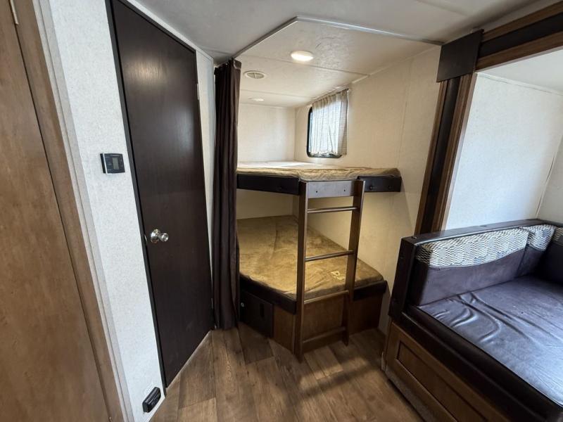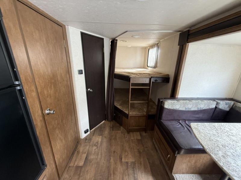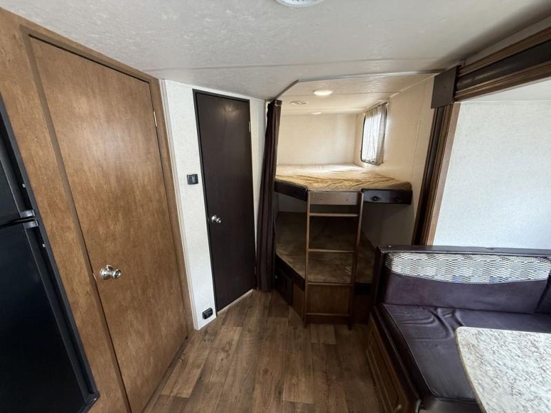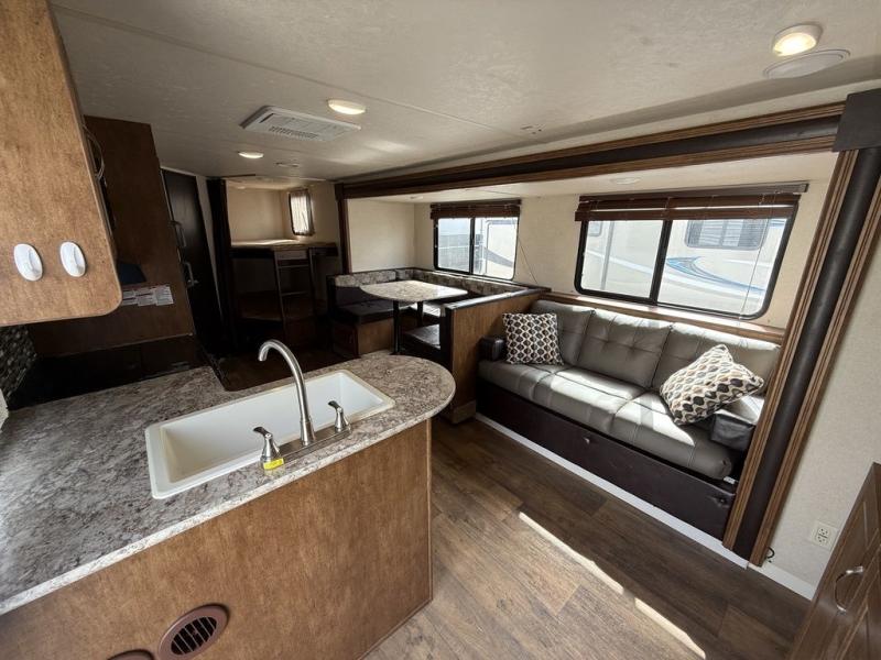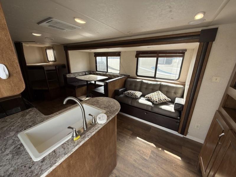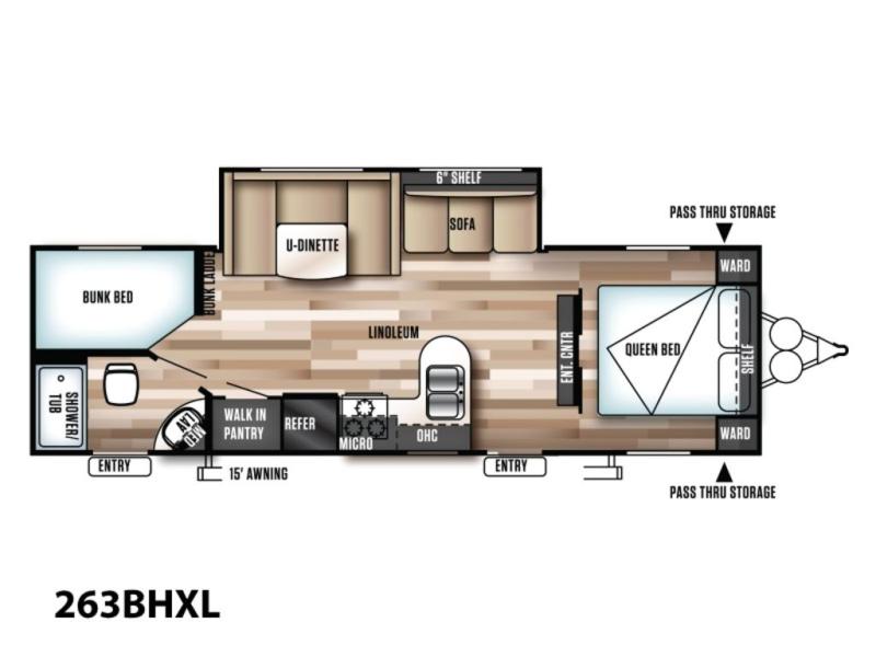 Come see just how fun and easy camping can be with this single slide out Wildwood X-Lite 263BHXL travel trailer. This model has two entry doors for easy access into the combined kitchen/living area or the rear door leads into the bathroom. Your kids will enjoy their own space with the rear set of bunk beds. Within the slide out there is a u-dinette as well as a sofa where you can enjoy your meals or reminisce about the day, and at night both the sofa and dinette easily convert into additional sleeping space. Along the front of this trailer under the front bedroom there is a pass through storage area plus enjoy the shade from the 16' awning and more!