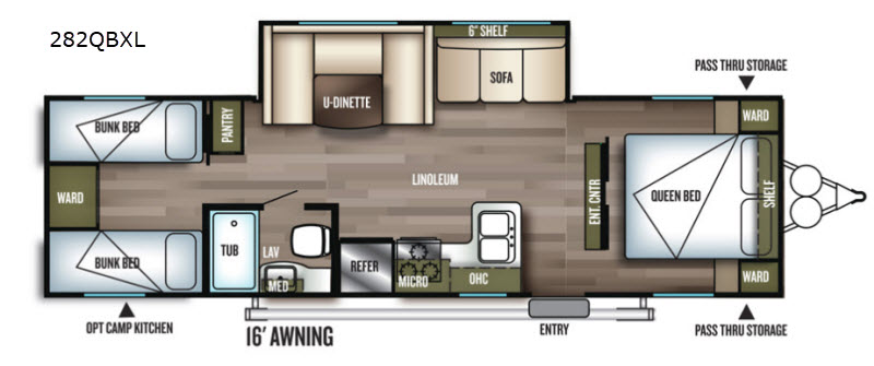 Enjoy camping with the whole family, or even a few extra guests in this Wildwood X-Lite travel trailer by Forest River. Model 282QBXL offers sleeping for nine with the rear private bunkhouse, plus a large slide out for added space inside making it comfortable for everyone! Along either side of the entertainment center there are sliding doors which close off the front bedroom. Outside there is a large pass through storage area for your extra camping gear. You can enjoy the shade from the 16' awning and if you enjoy the ability to cook outdoors then you will want to add the optional camp kitchen!