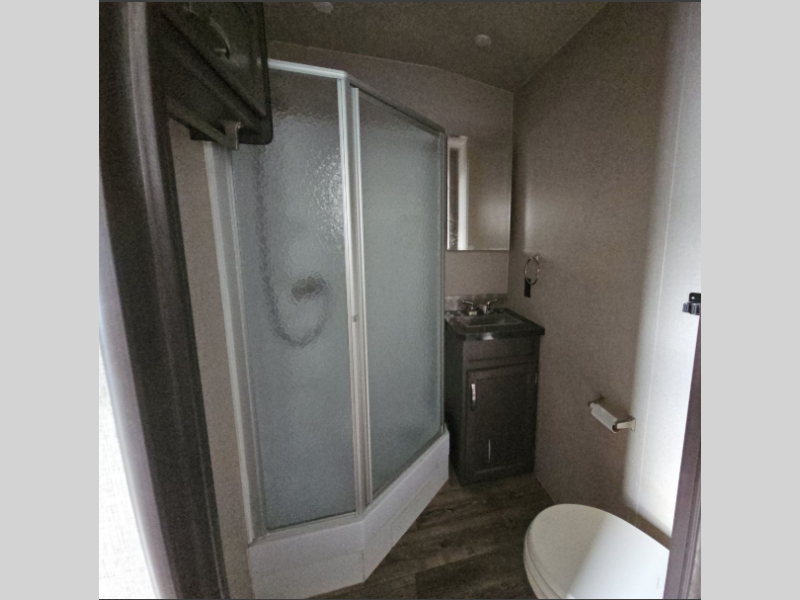 The side aisle bath includes an angled shower, sink, toilet, and overhead storage for your linens.