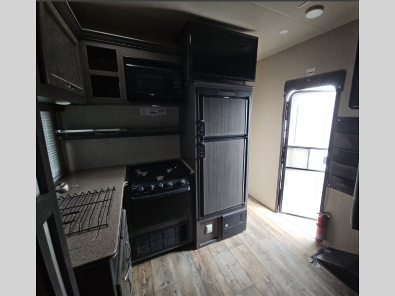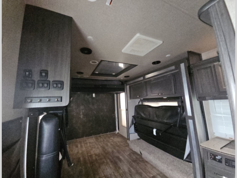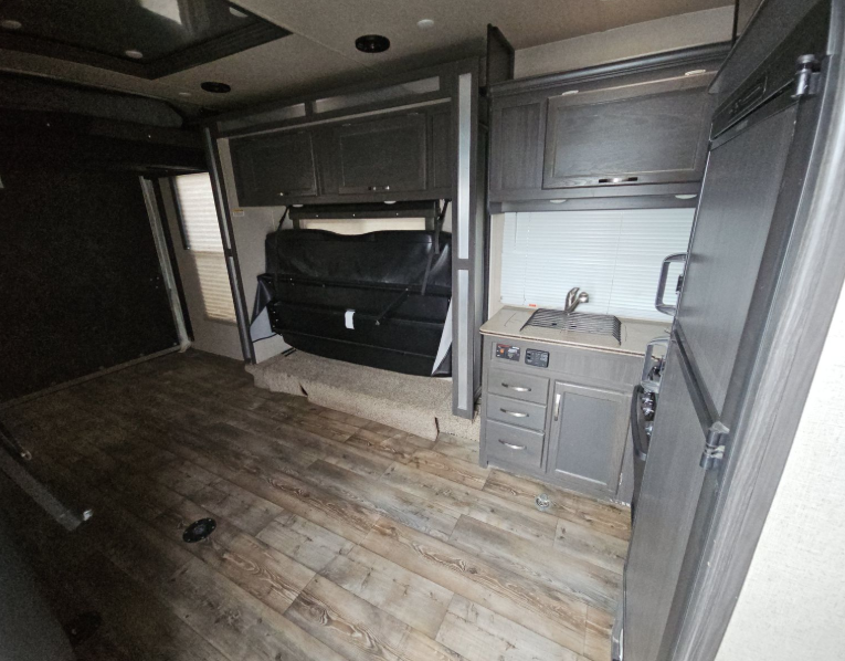 As you enter to your right you will see a side aisle bath and front bedroom. Straight ahead and to your left, the cargo area includes the kitchen and living appliances and furniture, plus additional sleeping accomodations.