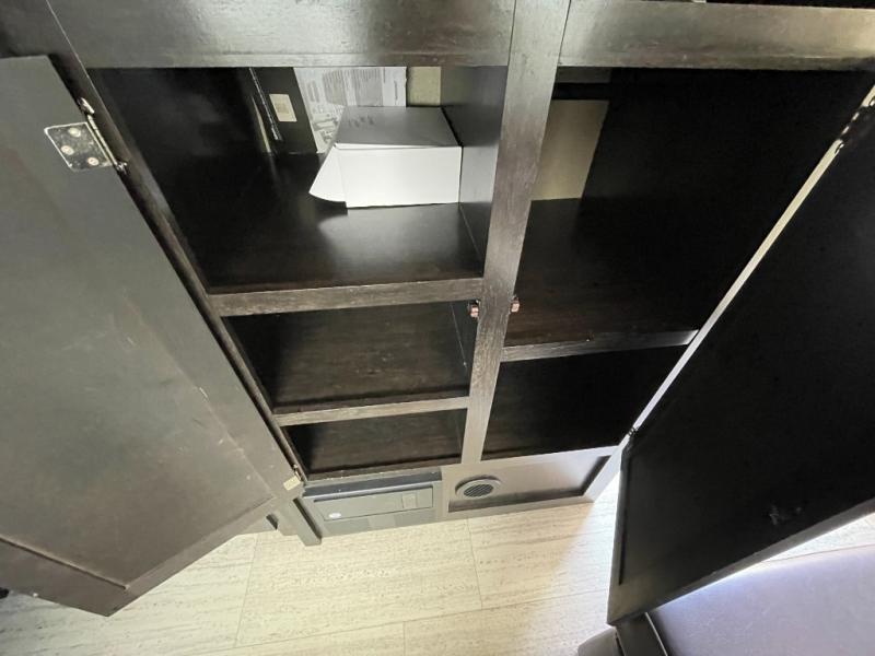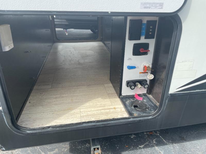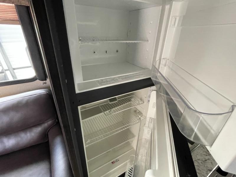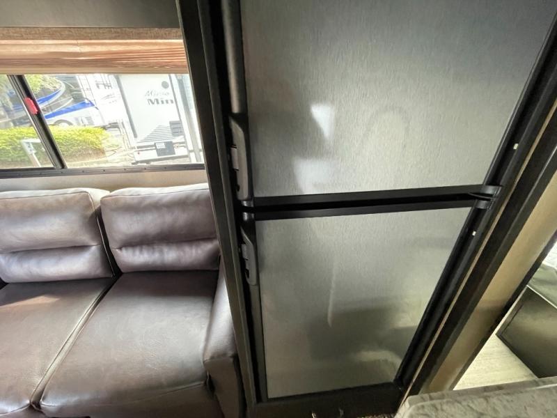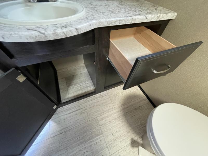 The spacious rear bath is a standout feature, offering residential-style comfort with a roomy shower, vanity, and linen storage—perfect for families who want extra convenience on the road.