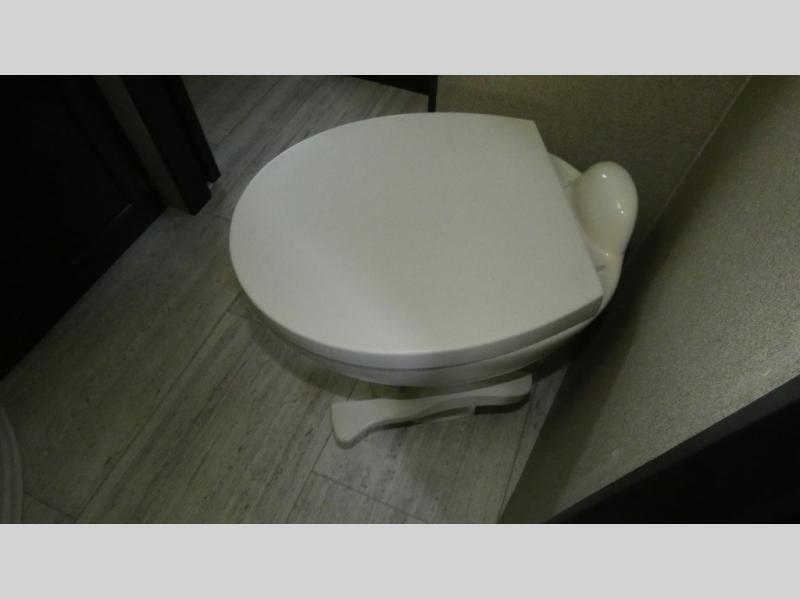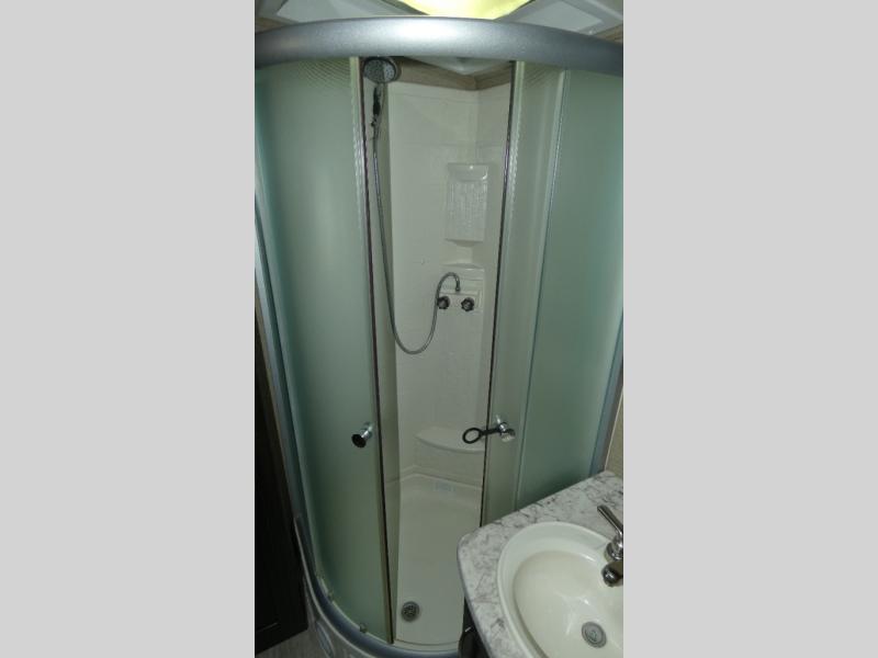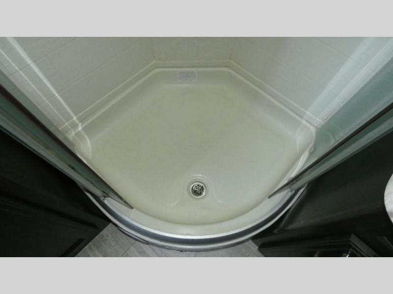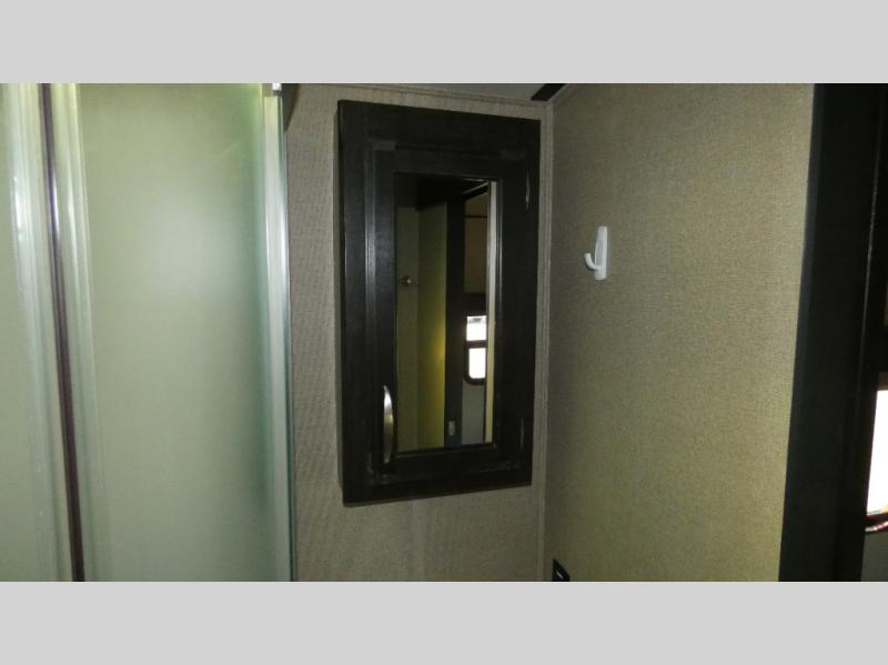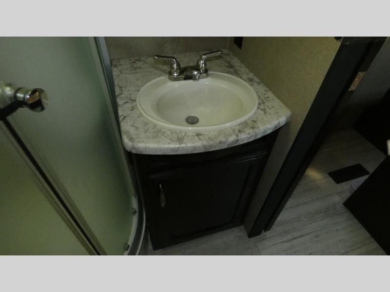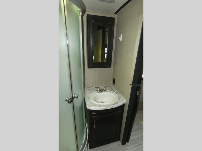 Step inside and find a complete bath straight ahead. This is a convenient location from anywhere in the trailer as well as from outside. Inside the bath find a radius shower with skylight, a sink, linen cabinet, and toilet. A second sliding bath entry door leads into the front master, which is very nice!