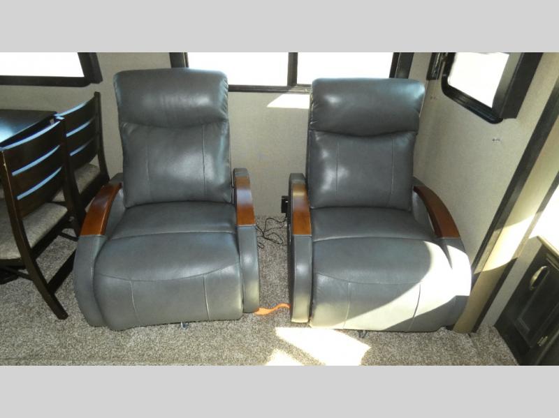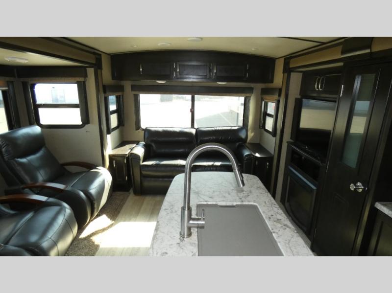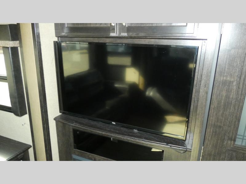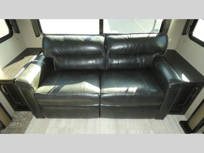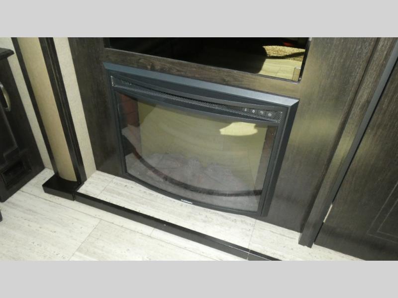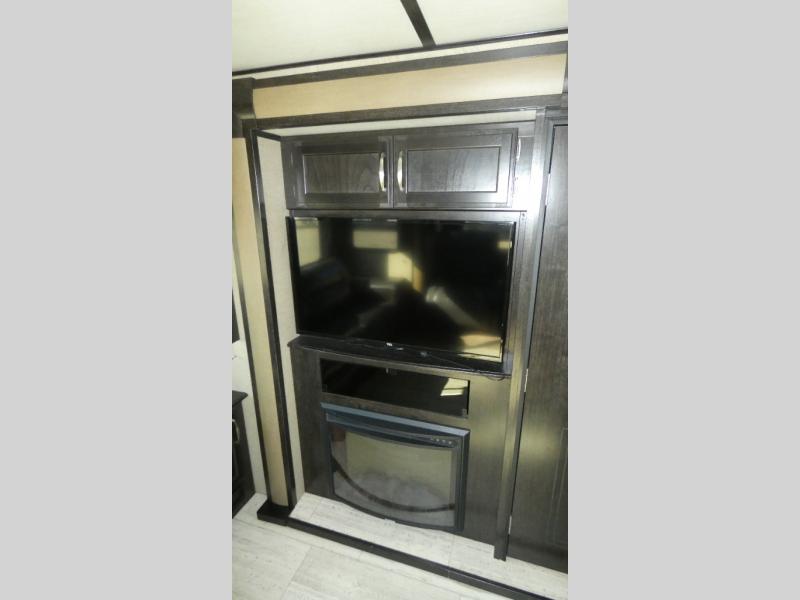 There is more seating and sleeping space available with the rear tri-fold sofa including overhead cabinets for storage, plus end tables as well. Adjacent is a second living area slide out that features an entertainment center with a 40" LED TV, a cozy fireplace, plus the kitchen appliances. The TV is easily viewable from any seating in the space.