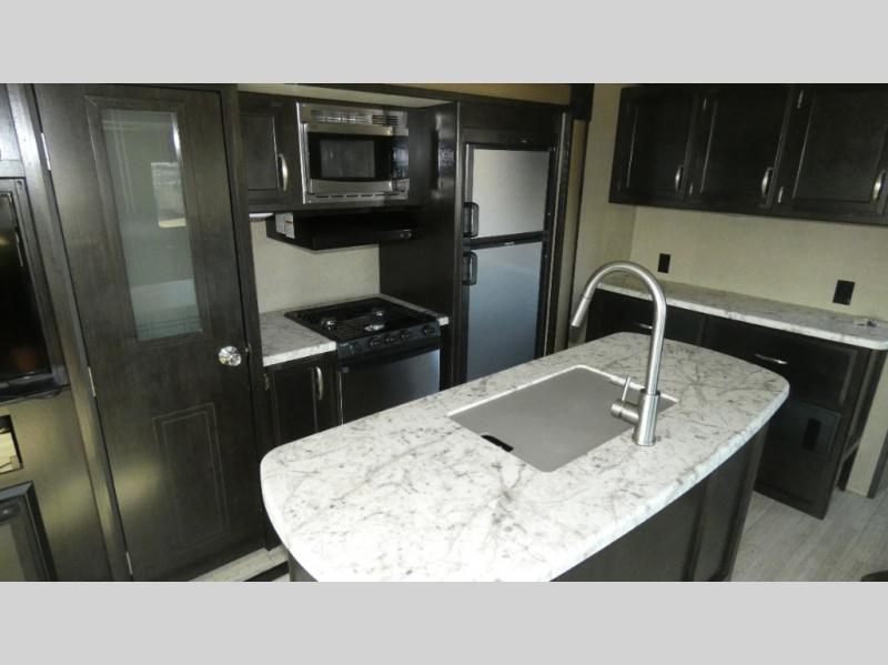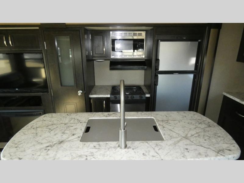 Cooking will not be an issue as this unit provides a refrigerator that features pet dishes beneath that pull out when in use. There is also a three burner range with overhead microwave oven, and a pantry for food storage also. There is a nice hutch along the interior wall for storing dishes and things, plus a convenient kitchen island including a large single sink, and so much more!