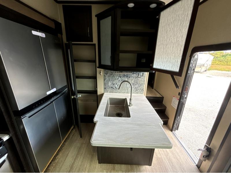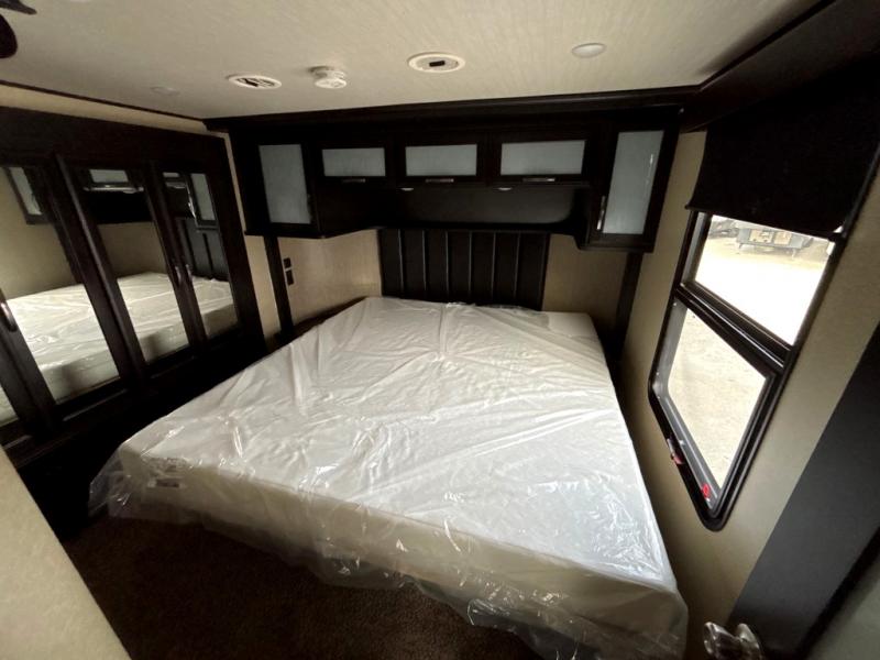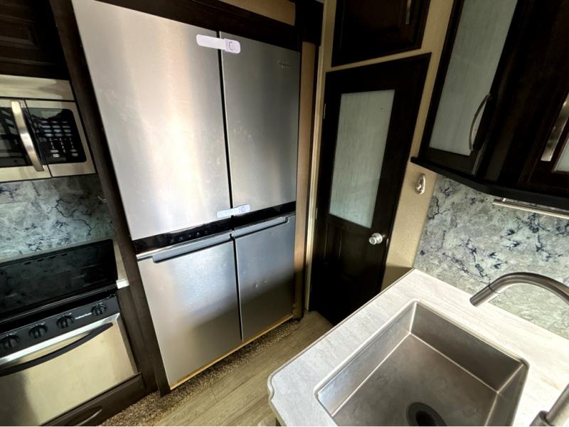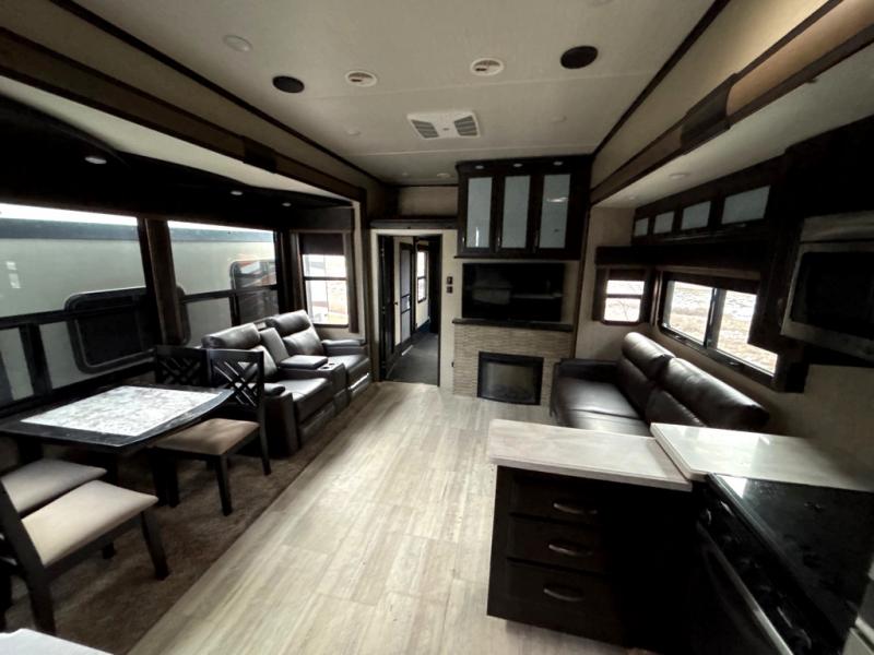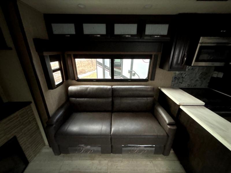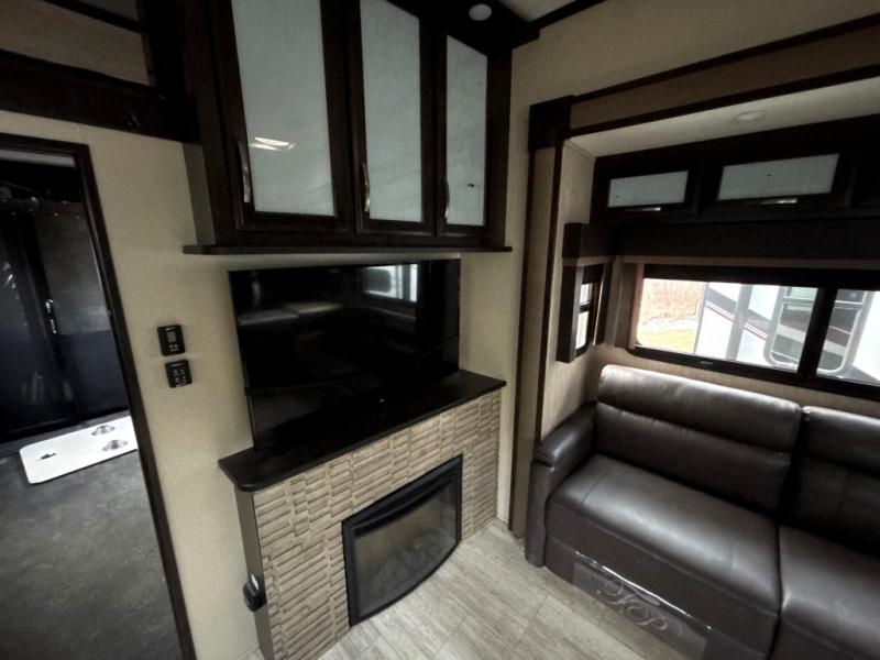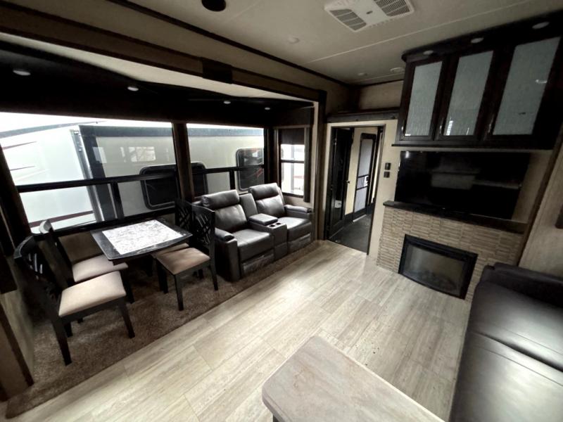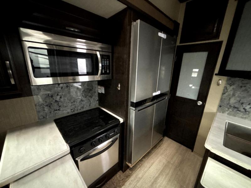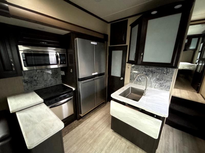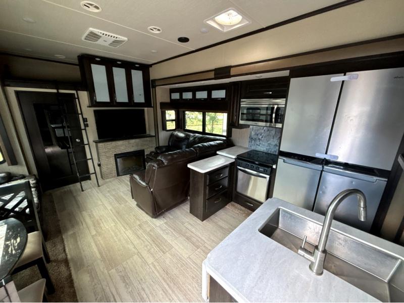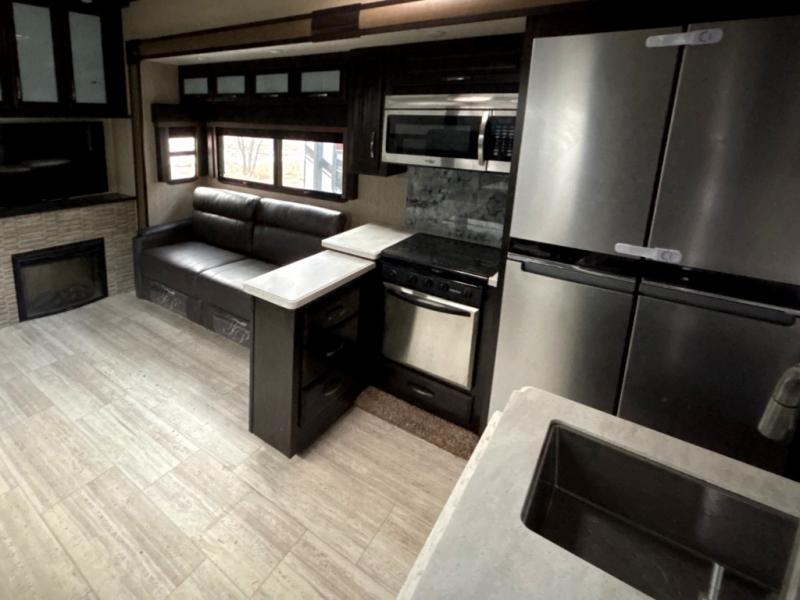 If you have been searching for a livable fifth wheel, this Solitude 384GK R might be the one! Just imagine making breakfast with the professional grade stainless steel cooktop and convection microwave. You might even prepare and serve the food on the kitchen island, and store leftovers in the stainless steel 18 cu. ft. residential refrigerator. When you and your spouse aren't exploring outside, you can work at the desk, or watch your favorite show on the big screen LED TV in the living area while staying warm by the fireplace. You will find plenty of storage throughout including for your shoes, dry goods, linens, and your wardrobe. You might even decide to add a washer and dryer, a dishwasher, and a pull-out kitchen outside. Come sit in this Solitude to see how comfortable you will be!