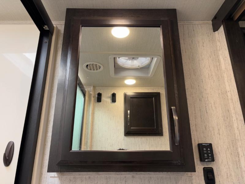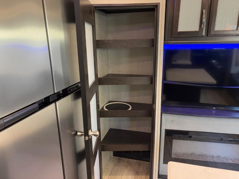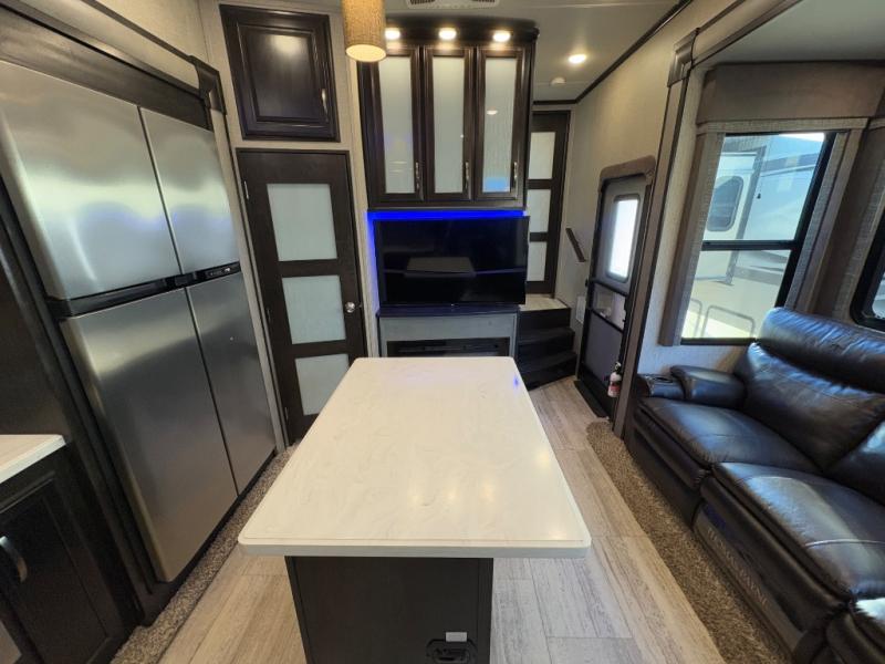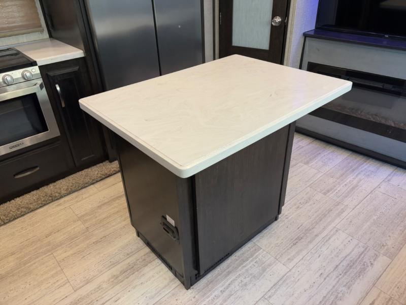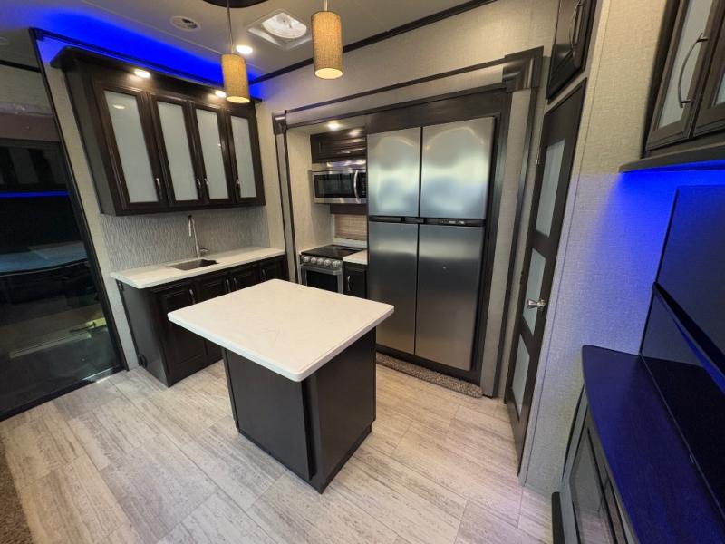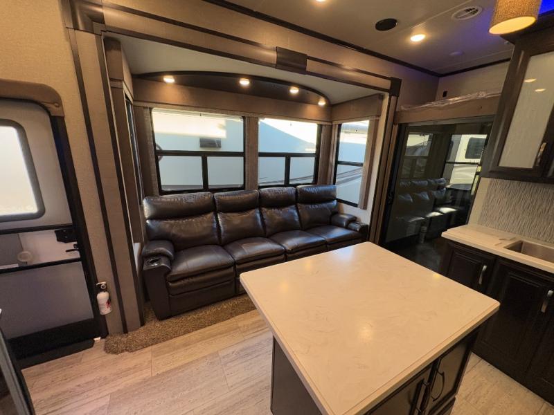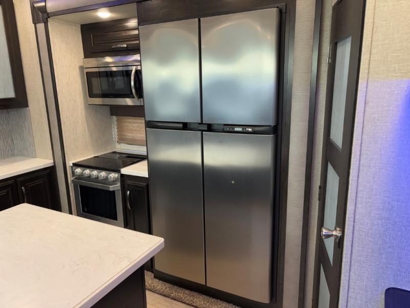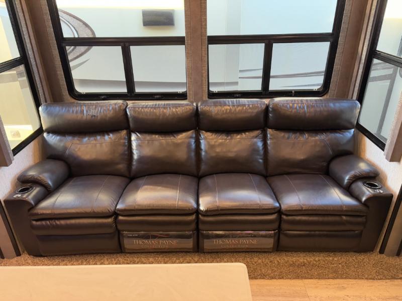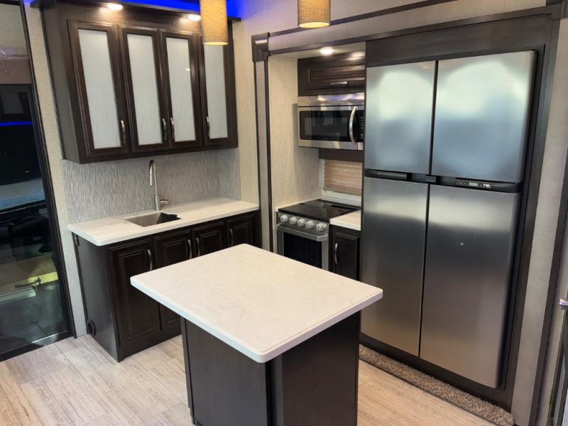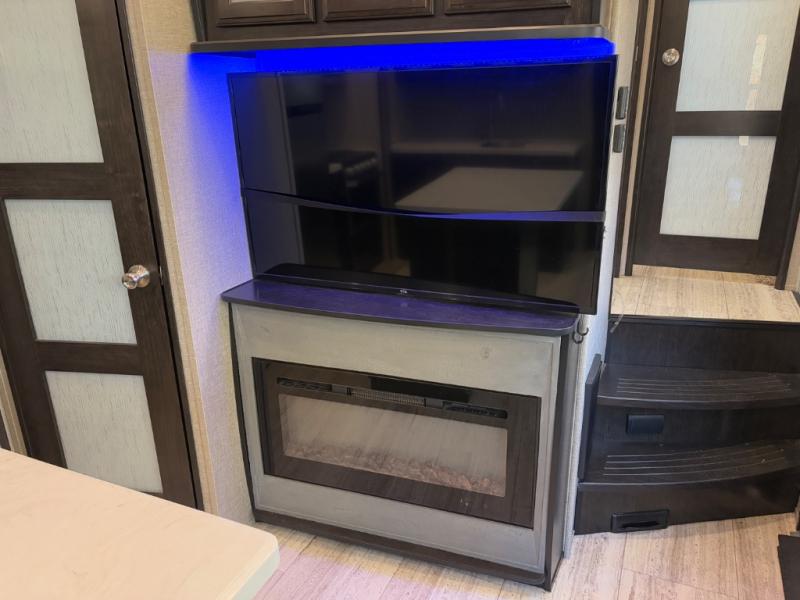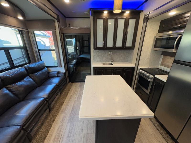 Imagine your family of 9 riding dirt bikes, four wheelers, or even a jet ski at your favorite destination. This Momentum M-Class 349M fifth wheel toy hauler offers a 13' garage for your toys and a side man door for easy access when the ramp door is closed. You can store additional outdoor gear in the exterior unobstructed pass-through storage near the main entrance. Now imagine your family watching the big game on the 49" LED TV with a fireplace below while sitting on the bar stools at the kitchen island or on the four-seat sofa. Now stop imagining and start living the dream in this M-Class!