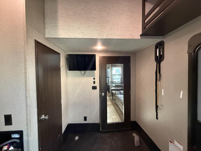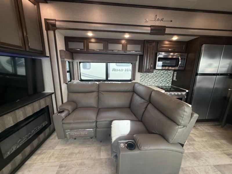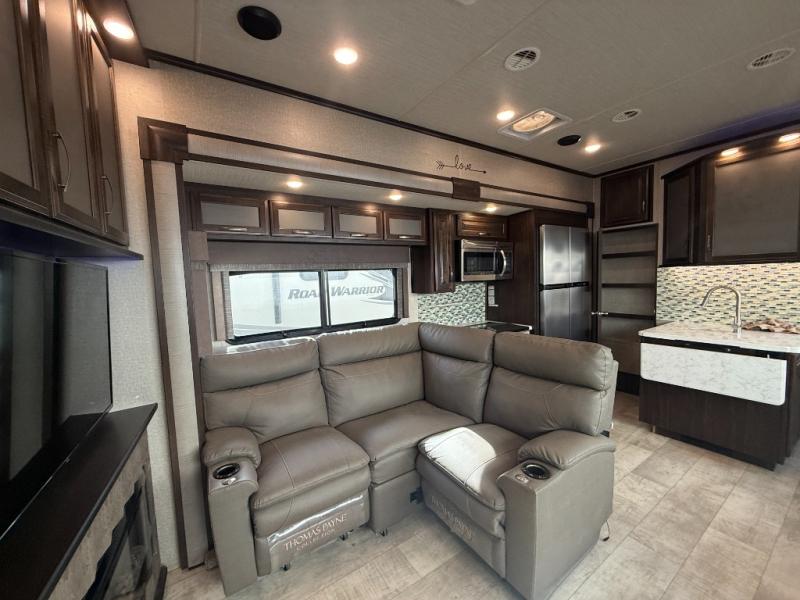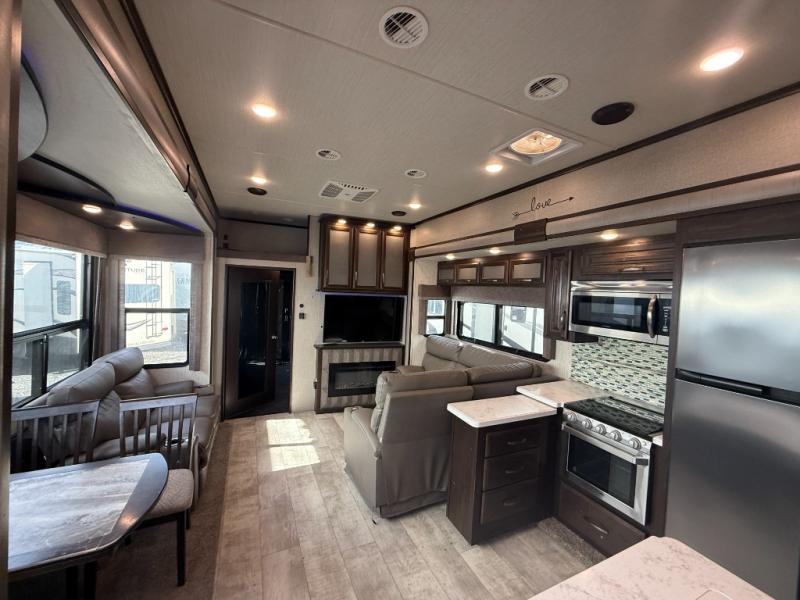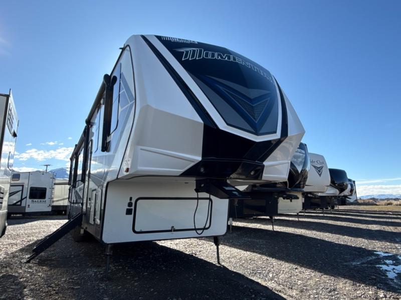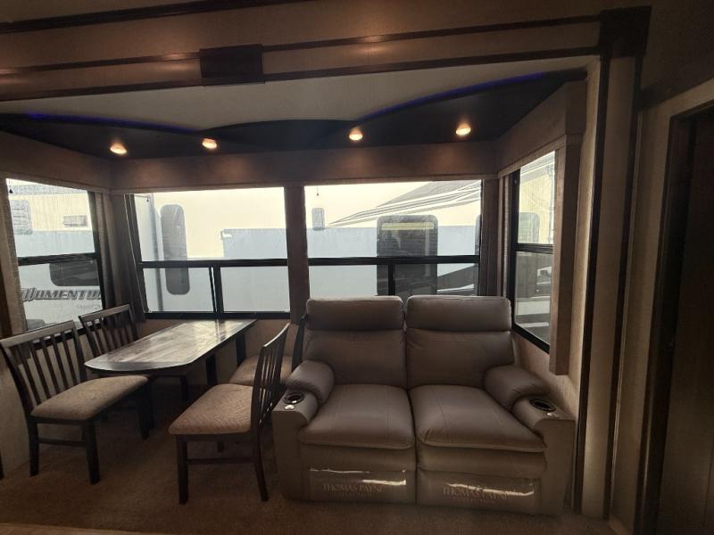 If relaxation and off-road fun have been calling your name, this Momentum M-Class 395M toy hauler fifth wheel will provide the luxury you love along with toy storage. From the garage featuring 12'6" of space for an ATV and dirt bikes and a half bath to a kitchen and living area with theatre seating, an L-shaped sofa, and a fireplace with a 49" LED TV above, you can relax indoors when you aren't having fun outdoors.