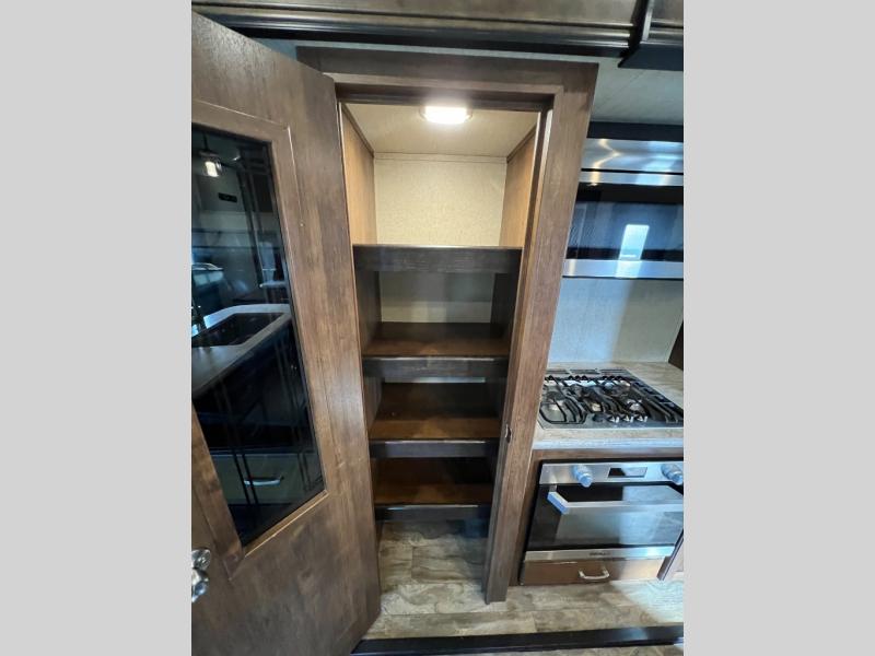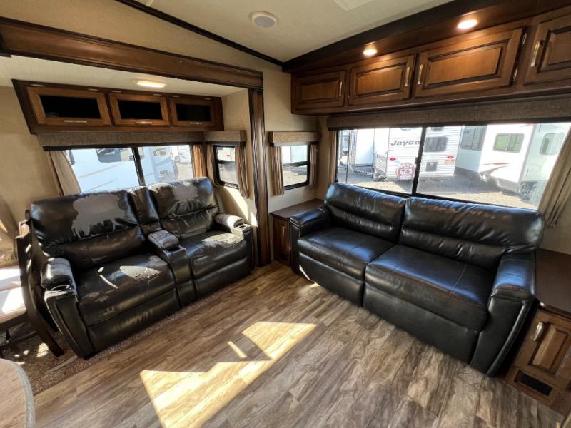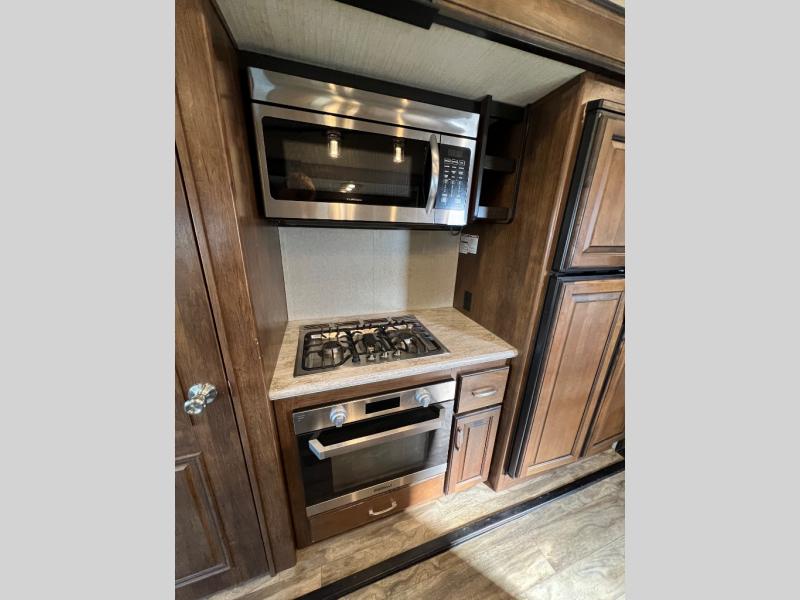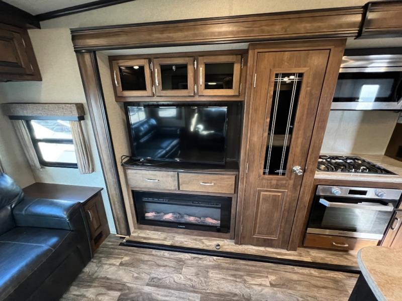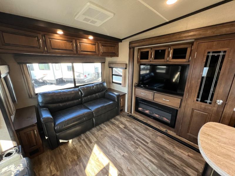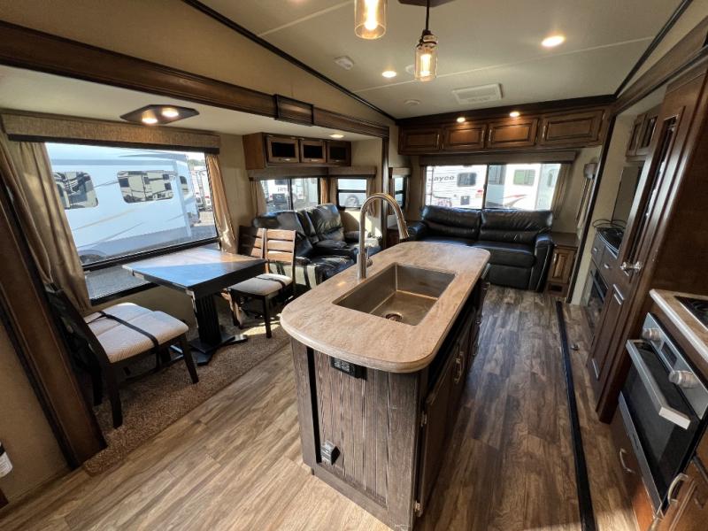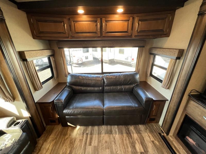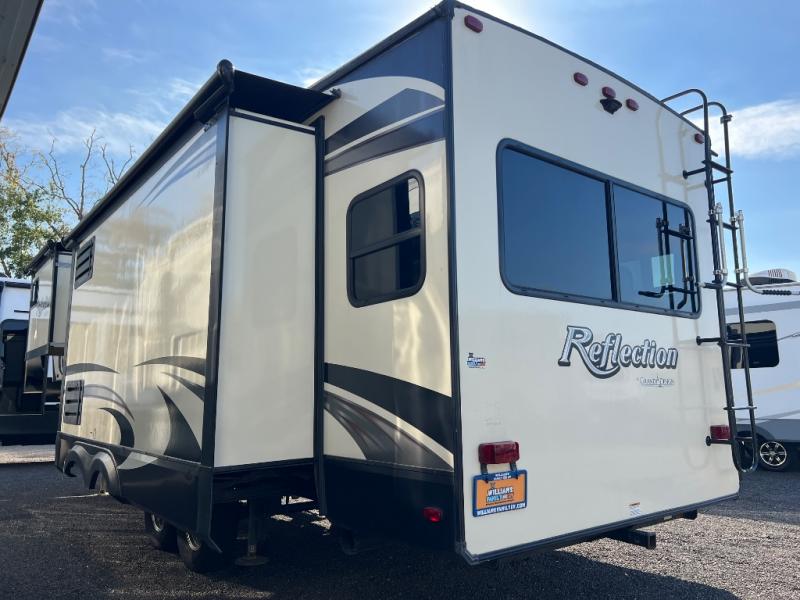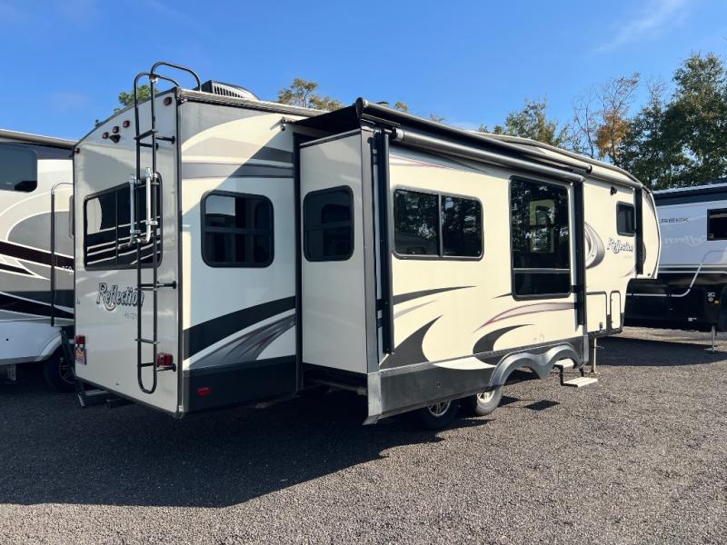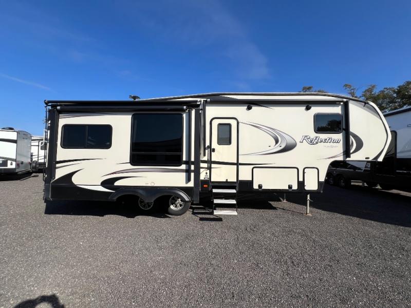 This Reflection 303RLS fifth wheel allows you to enjoy the comforts of home while moving from place to place with your spouse or smaller family. If you can imagine sitting in the rear living area on a tri-fold sofa bed after making dinner and serving the food from the kitchen island, this model is for you. You are sure to love the farm sink also. Even if you enjoy being outside most of the time, the weather might have you coming inside to watch the 40" TV or cozy up to the fireplace. Don't forget about storing your camp chairs and golf clubs in the unobstructed pass-through compartment if you need a dry place for those items. This model has many more standard features to enjoy and options to choose from, come see today!
