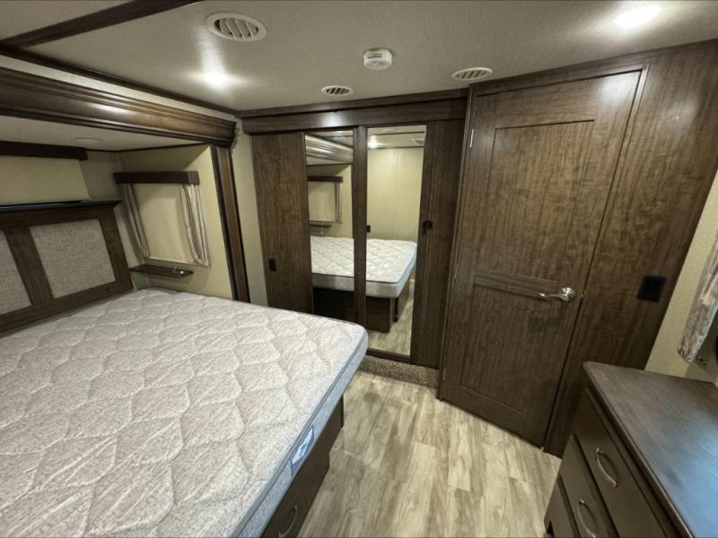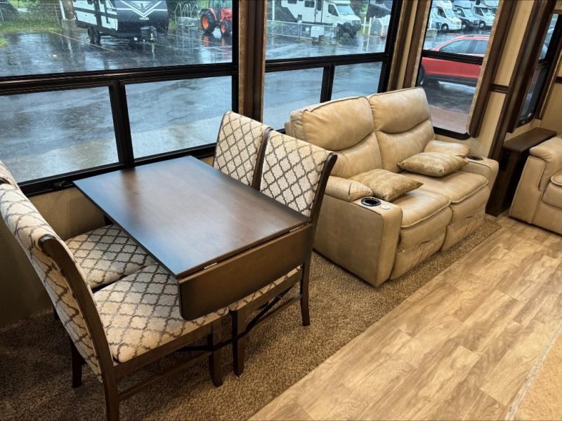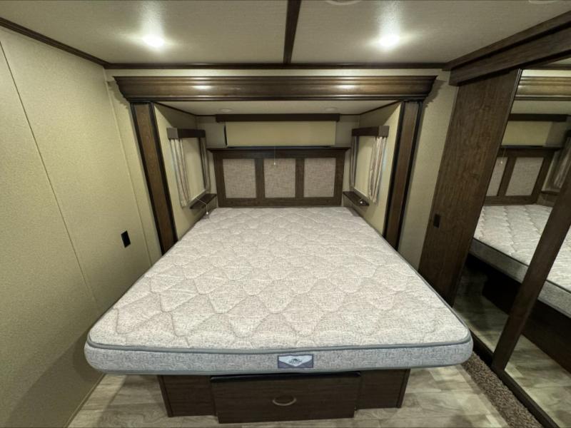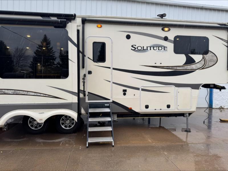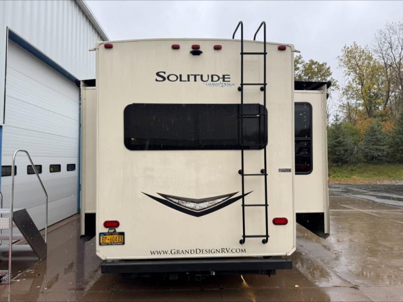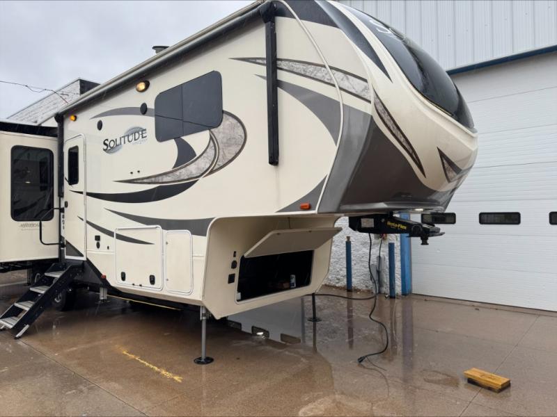 With each Solitude fifth wheel by Grand Design you will receive affordable luxury for your extended stays or weekend get-a-ways. From the solid foundation including a Equa-Flex suspension to the taller ceilings, taller and deeper cabinets, the power reclining theatre seating with swivel table including a heat and massage function, a pet dish drawer, a Stealth AC system, and the Weather-Tek package which allows you to travel any season you choose. It's time to enjoy luxury living where ever you decide to land.