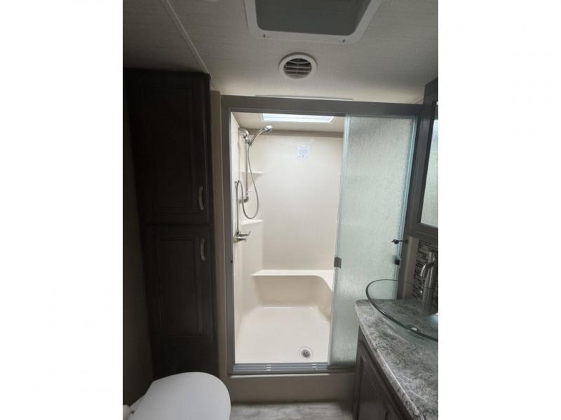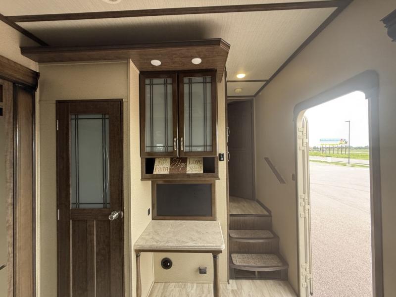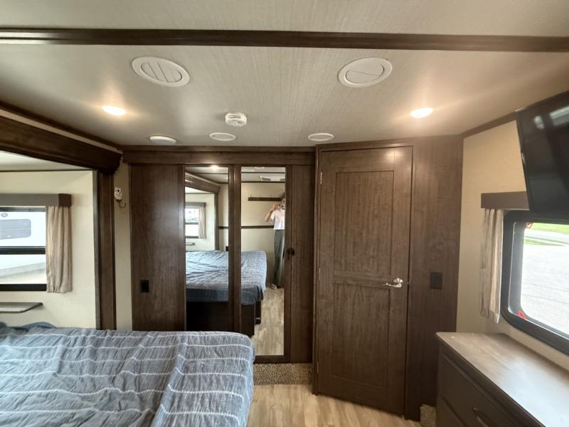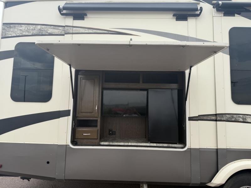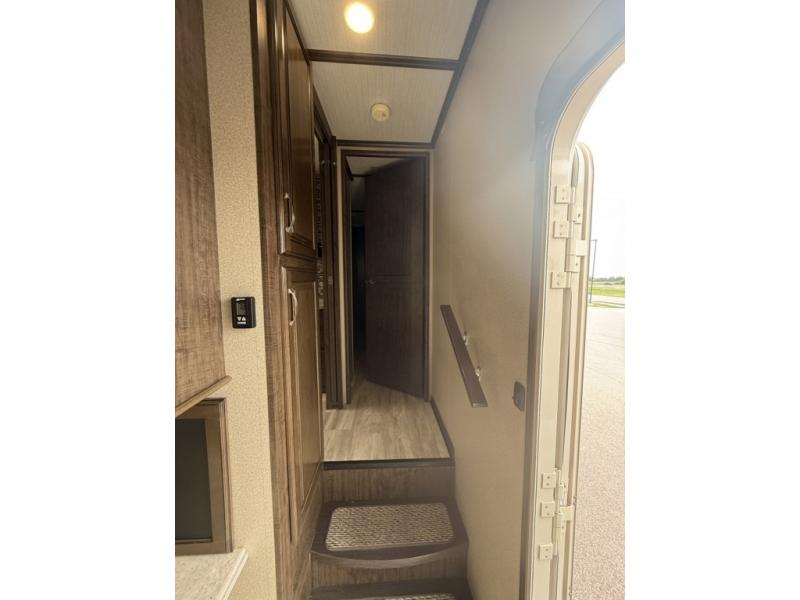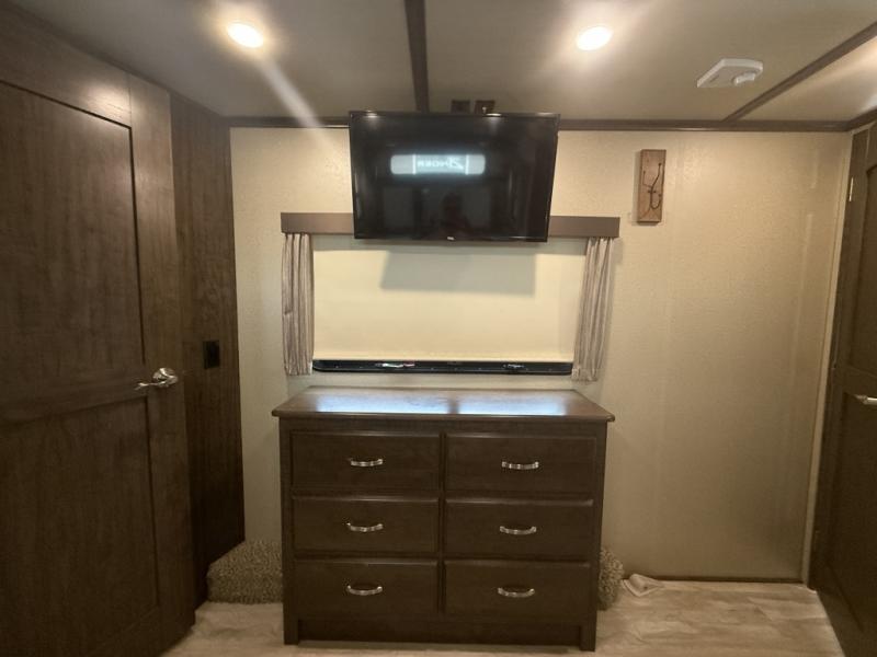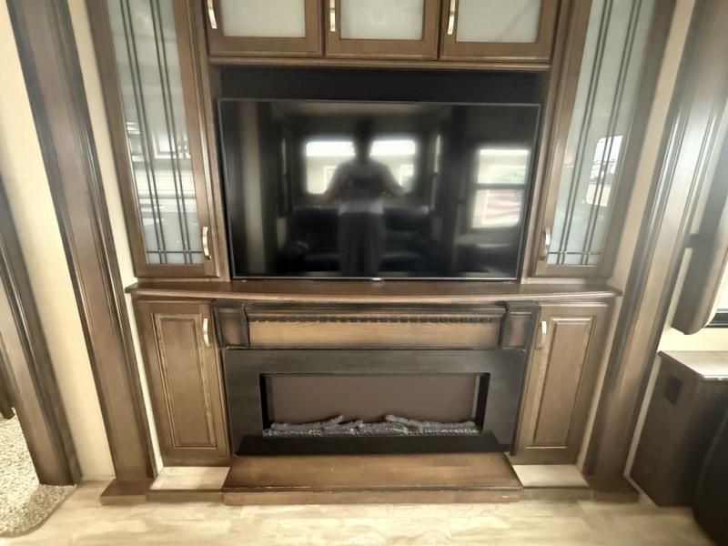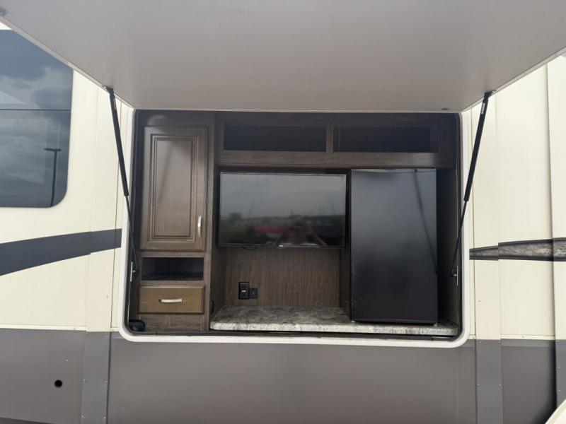Outside enjoy an exterior LED TV and refrigerator to keep cold drinks handy. You will also love the unobstructed pass-through storage compartment for all of your outdoor camping items, plus universal docking station, and so much more!