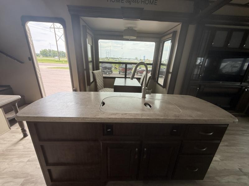 Step inside and notice how open and spacious the kitchen is. There are dual opposing slides in this area alone with the first slide to the left of the entry door featuring a free standing dinette. Opposite you will find a slide out 18 cu. ft. refrigerator, a three burner range with overhead microwave oven, and overhead cabinetry with a bit of counter space. You will love the center island which features a double sink, plenty of prep space, and it has also been prepped for a dishwasher. Add this option and spend more time outdoors rather than doing the dishes after each meal! To finish out the kitchen, along the interior wall, you will find a pantry, plus more counter and storage space for your dry goods and daily dishes.