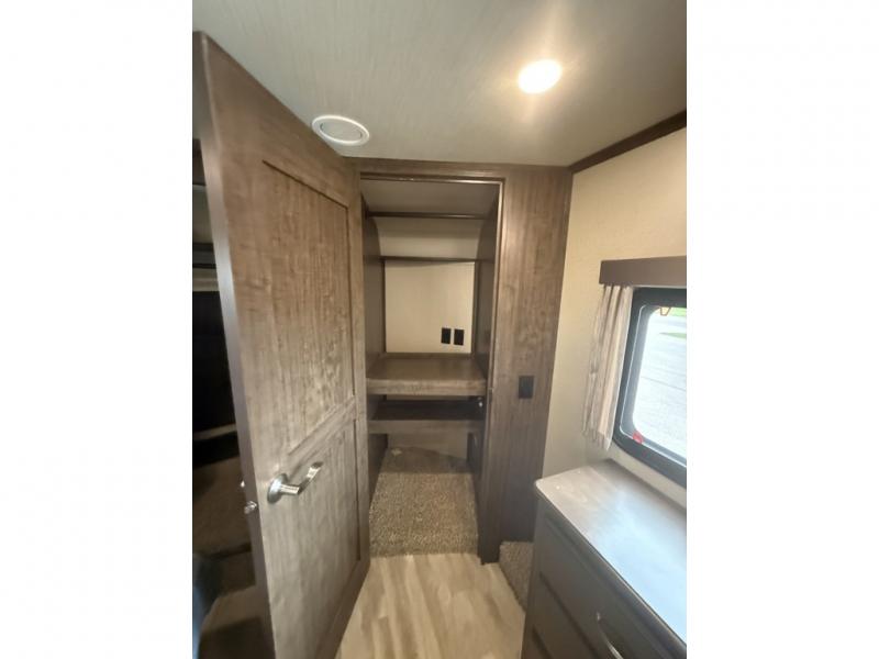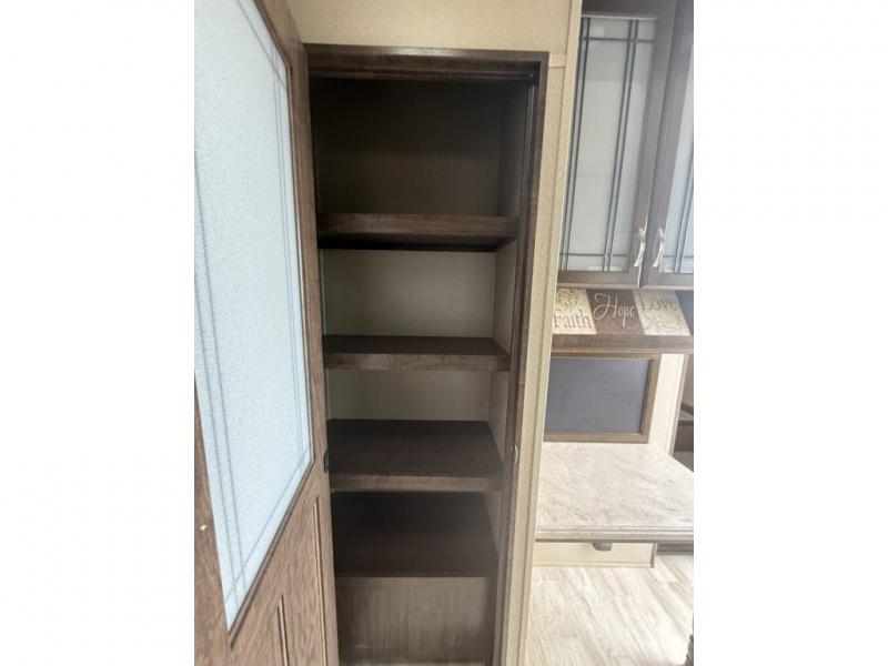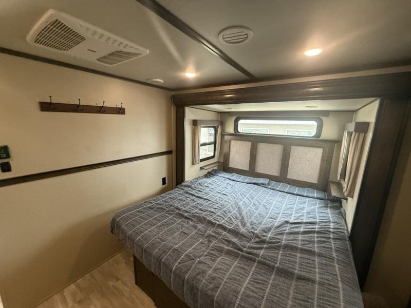 Just outside the bathroom there is a door to the front private bedroom. Here you will enjoy plenty of room thanks to a slide out queen bed including a pull-out ottoman. There is a full front wardrobe for your hanging clothes, shirt storage, a dresser, and a closet that has been prepped for a washer and dryer. No pile of dirty laundry to take home here when you choose this option.