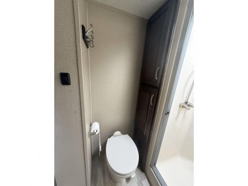 Back through to the rear of this unit you will find a living area including a slide out with theatre seating along the roadside, a slide out entertainment center with LED TV and fireplace opposite, plus a tri-fold sofa including overhead cabinets along the rear wall. This can also become added sleeping space for overnight guests.