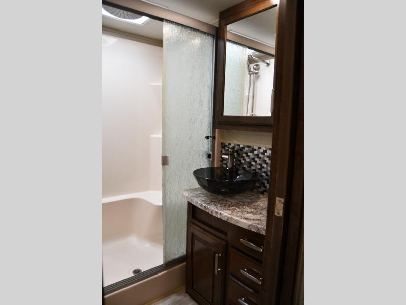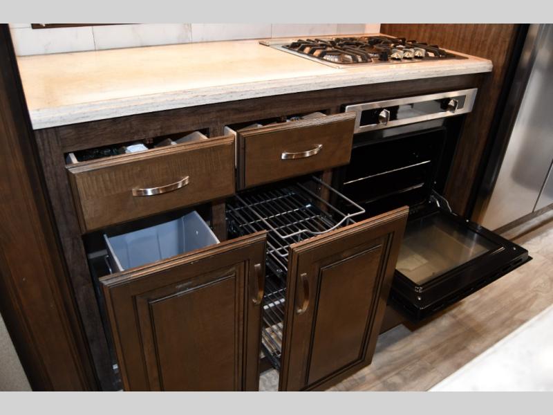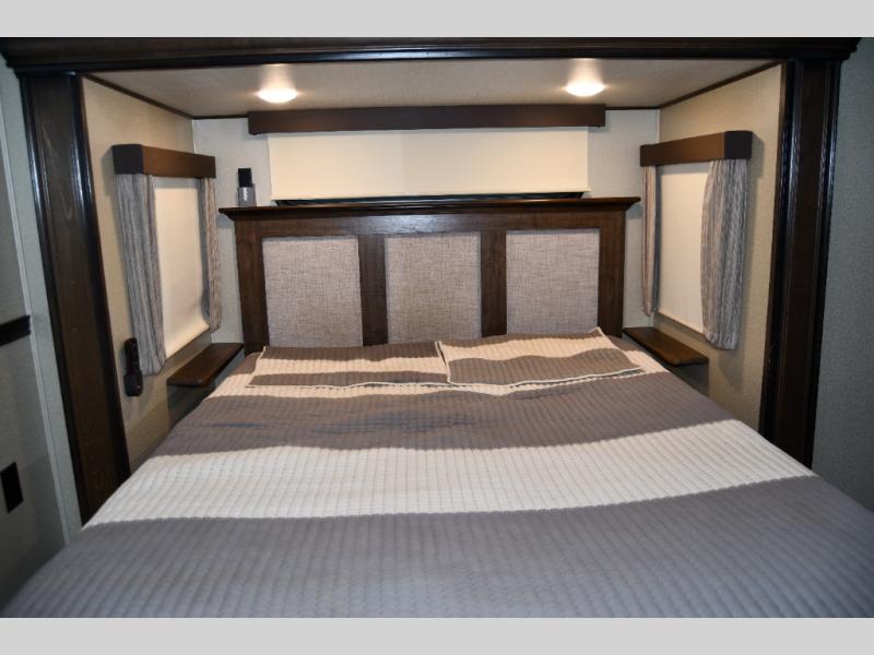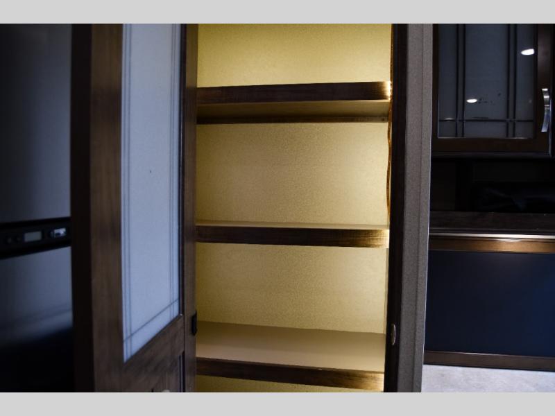 The residential-style kitchen offers ample counter space, a large pantry, and quality appliances, making meal prep easy whether you’re on a weekend getaway or living on the road full time. The private master suite includes a queen bed, generous closet storage, and washer/dryer prep, while the spacious bathroom provides a true at-home feel with a large shower and linen storage.