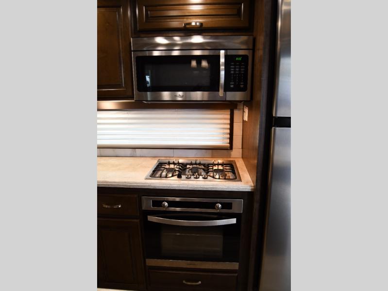 Step inside and notice how open and spacious the kitchen is. There are dual opposing slides in this area alone with the first slide to the left of the entry door featuring a free standing dinette. Opposite you will find a slide out 18 cu. ft. refrigerator, a three burner range with overhead microwave oven, and overhead cabinetry with a bit of counter space. You will love the center island which features a double sink, plenty of prep space, and it has also been prepped for a dishwasher. Add this option and spend more time outdoors rather than doing the dishes after each meal! To finish out the kitchen, along the interior wall, you will find a pantry, plus more counter and storage space for your dry goods and daily dishes.