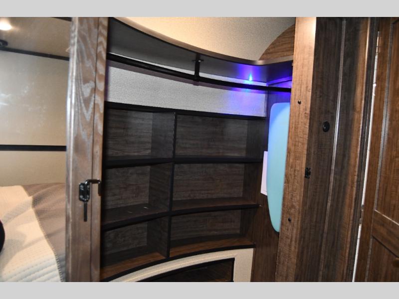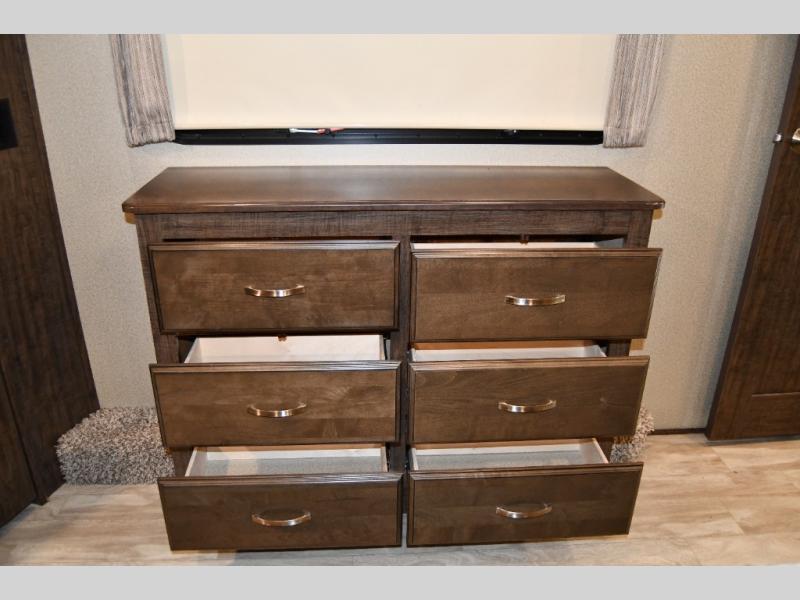 Just outside the bathroom there is a door to the front private bedroom. Here you will enjoy plenty of room thanks to a slide out queen bed including a pull-out ottoman. There is a full front wardrobe for your hanging clothes, shirt storage, a dresser, and a closet that has been prepped for a washer and dryer. No pile of dirty laundry to take home here when you choose this option.