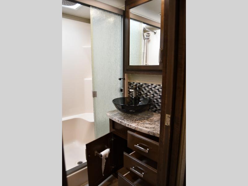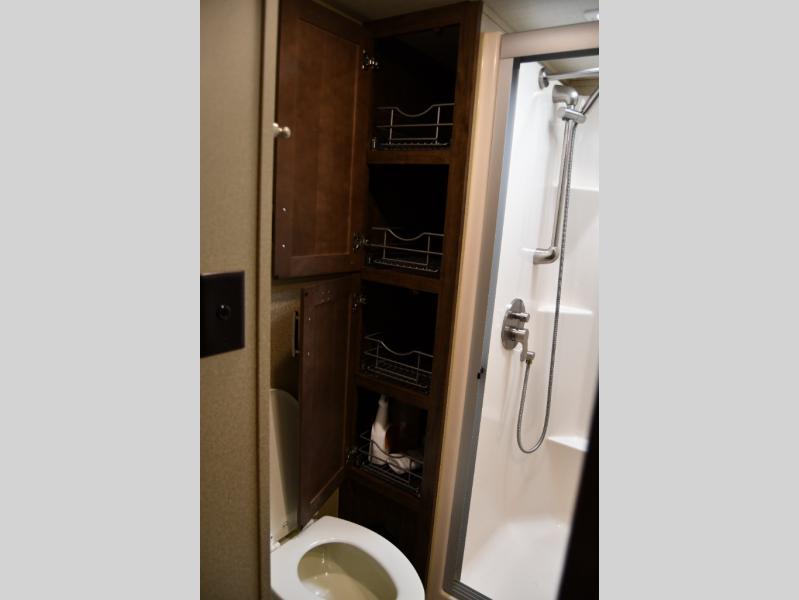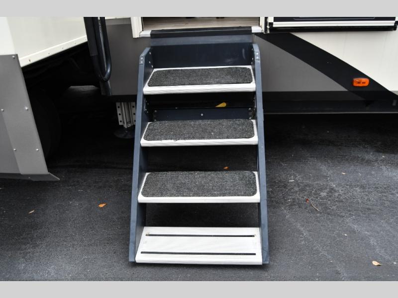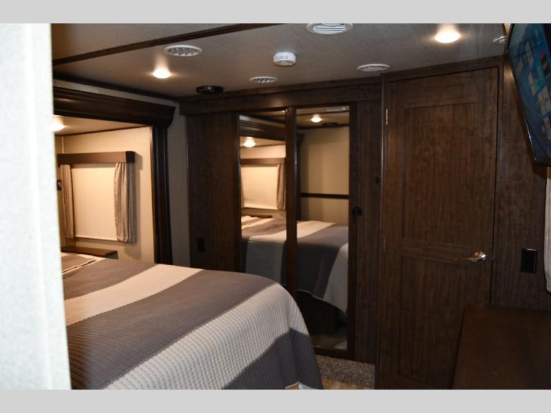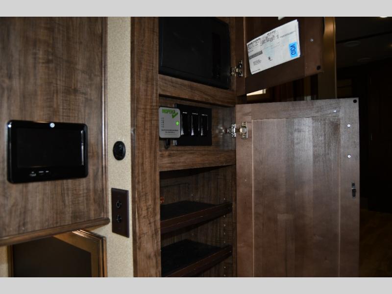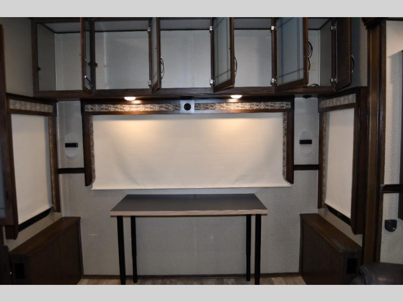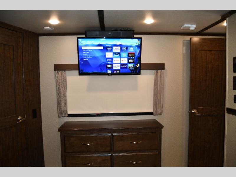 Outside enjoy an exterior LED TV and refrigerator to keep cold drinks handy. You will also love the unobstructed pass-through storage compartment for all of your outdoor camping items, plus universal docking station, and so much more!