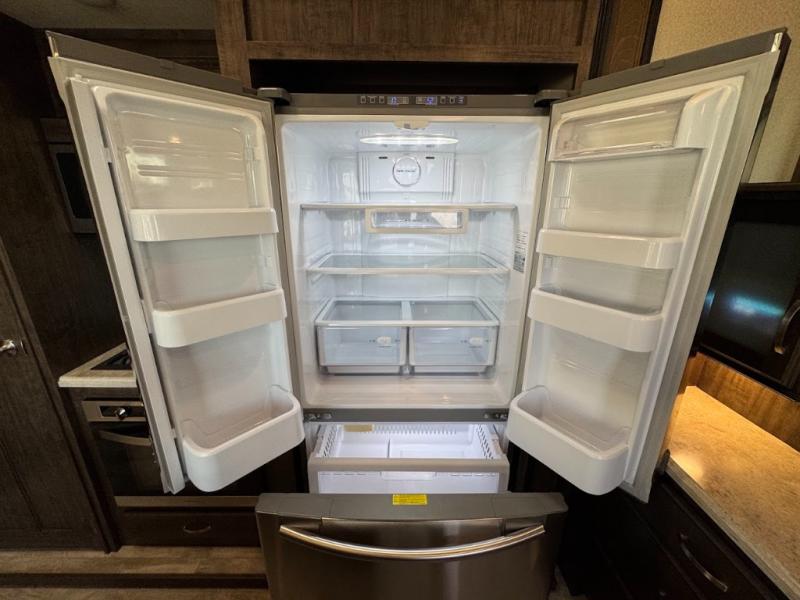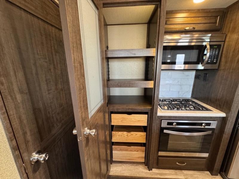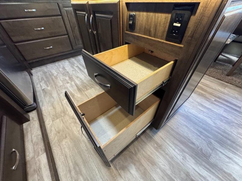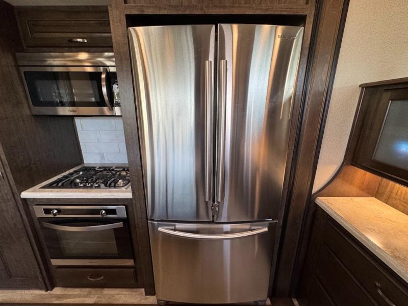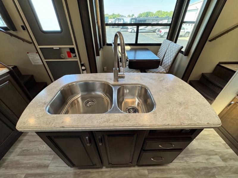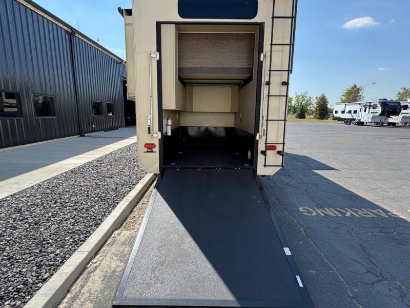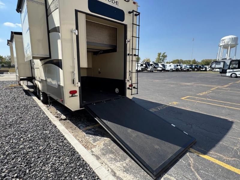 Dreaming about all the places you can take your off-road toy with you as well as your own bedding, living and kitchen area? This Solitude 374TH R toy hauler fifth wheel includes a unique below floor garage underneath the rear bedroom. Once the bed is lifted the garage's height extends to 77" from 65" tall. While your toy is securely stored, you can sleep in comfort and watch TV just before bedtime. You can choose to cook inside on the professional grade stainless steel cooktop after grabbing the ingredients from the stainless steel 18 cu. ft. residential refrigerator, or outdoors on the outside kitchen while watching TV. The front living area offers plenty of seating, a fireplace, and a TV for those inside camping days. So load up your toy and all your gear to hit the dunes, mountains, or countryside.