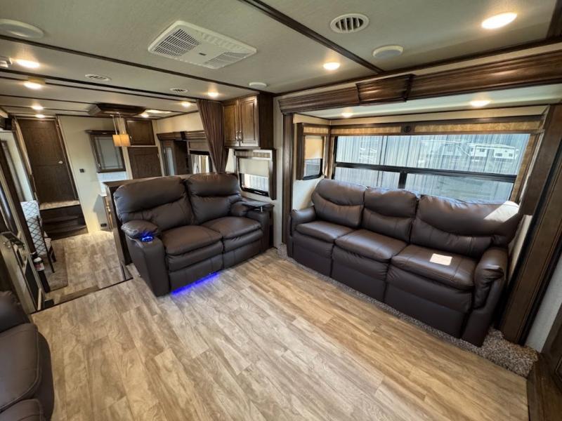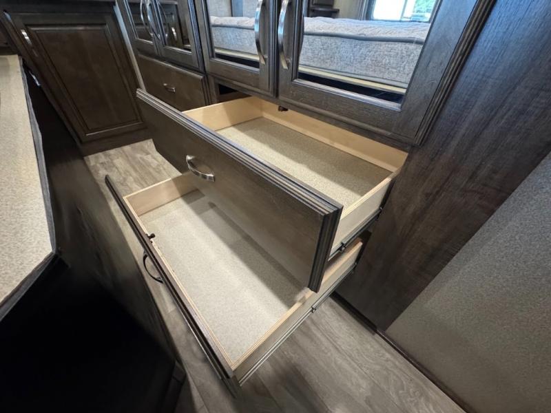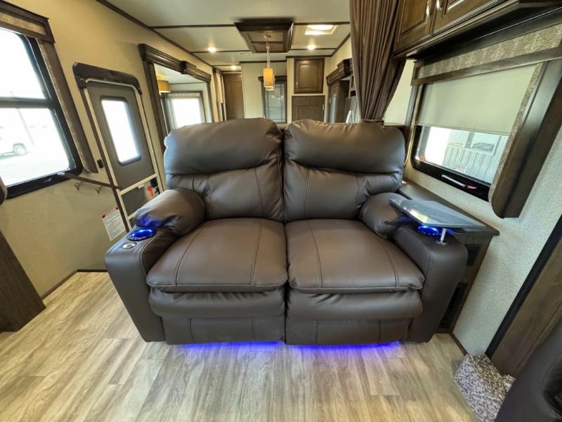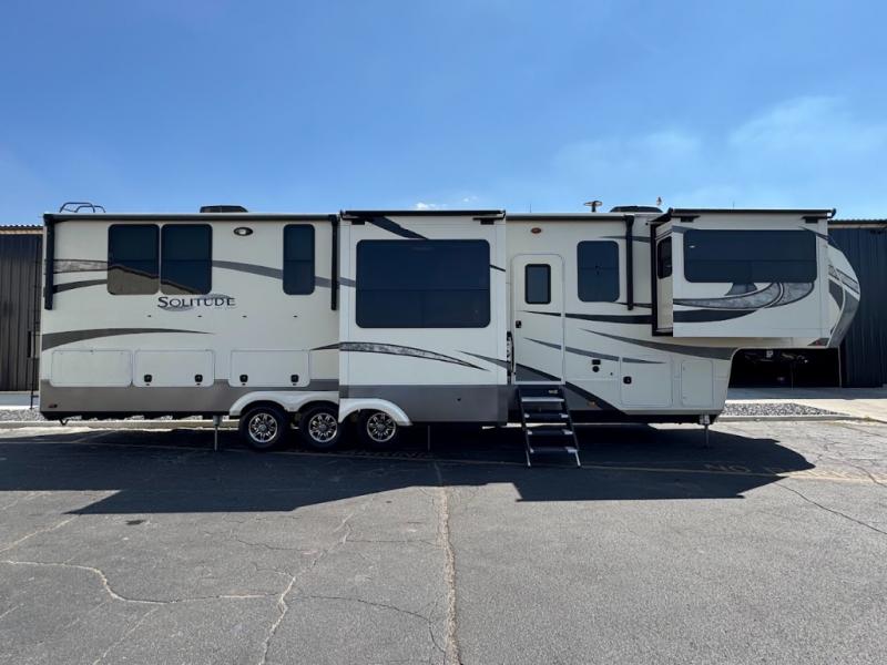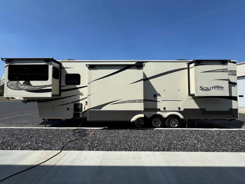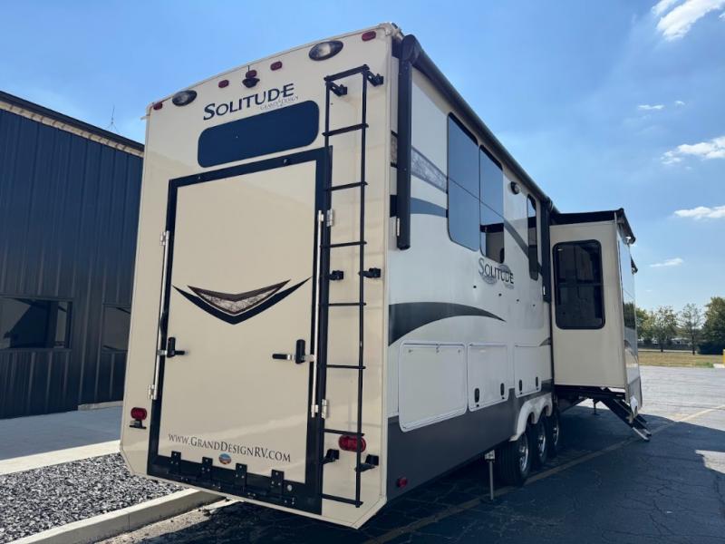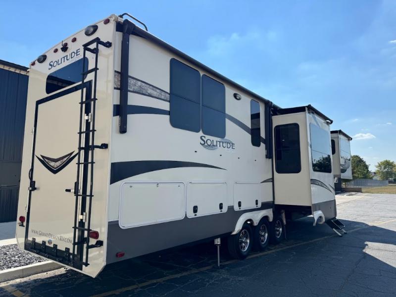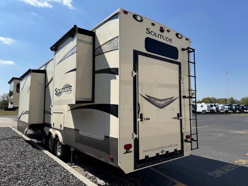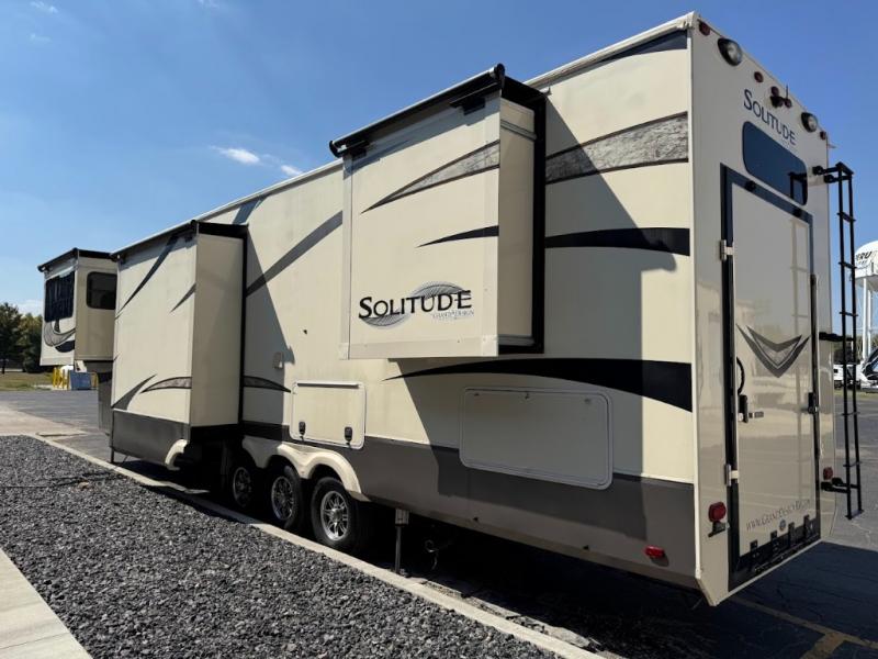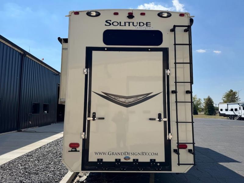 With each Solitude toy hauler fifth wheel by Grand Design you will receive affordable luxury for your extended stays or weekend get-a-ways. From the solid foundation including a Equa-Flex suspension to the taller ceilings, taller and deeper cabinets, the power reclining theatre seating with swivel table including a heat and massage function, a pet dish drawer, a Stealth AC system, and the Weather-Tek package which allows you to travel any season you choose. It's time to enjoy luxury living where ever you decide to land.