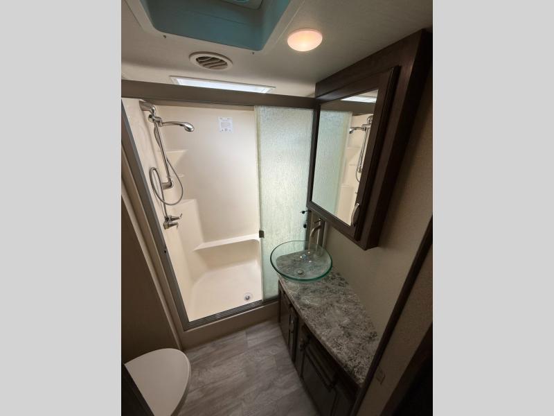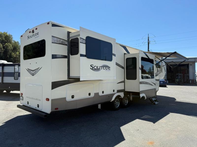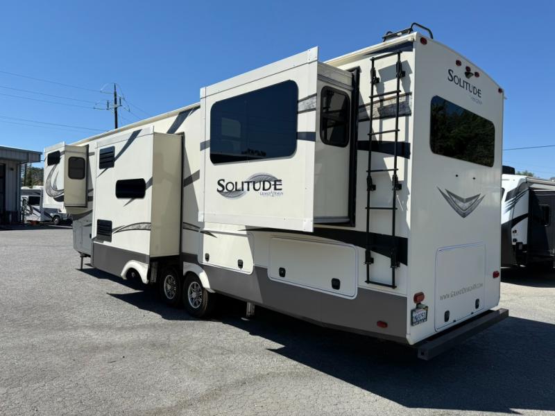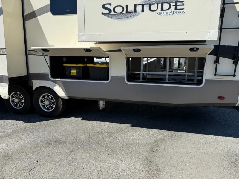 With each Solitude fifth wheel by Grand Design you will receive affordable luxury for your extended stays or weekend get-a-ways. From the solid foundation including a Equa-Flex suspension to the taller ceilings, taller and deeper cabinets, the power reclining theatre seating with swivel table including a heat and massage function, a pet dish drawer, a Stealth AC system, and the Weather-Tek package which allows you to travel any season you choose. It's time to enjoy luxury living where ever you decide to land.